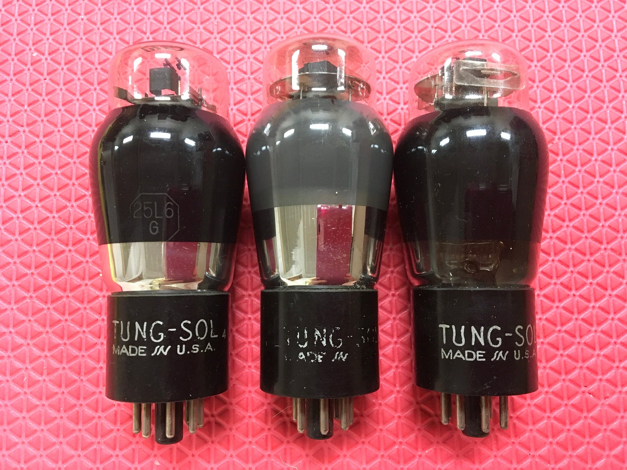 These three Tung-Sol coated glass 25L6G tubes were tested on our Paul Hart-calibrated TV7/U for shorts, gas and transconductance. There were no shorts or gas.