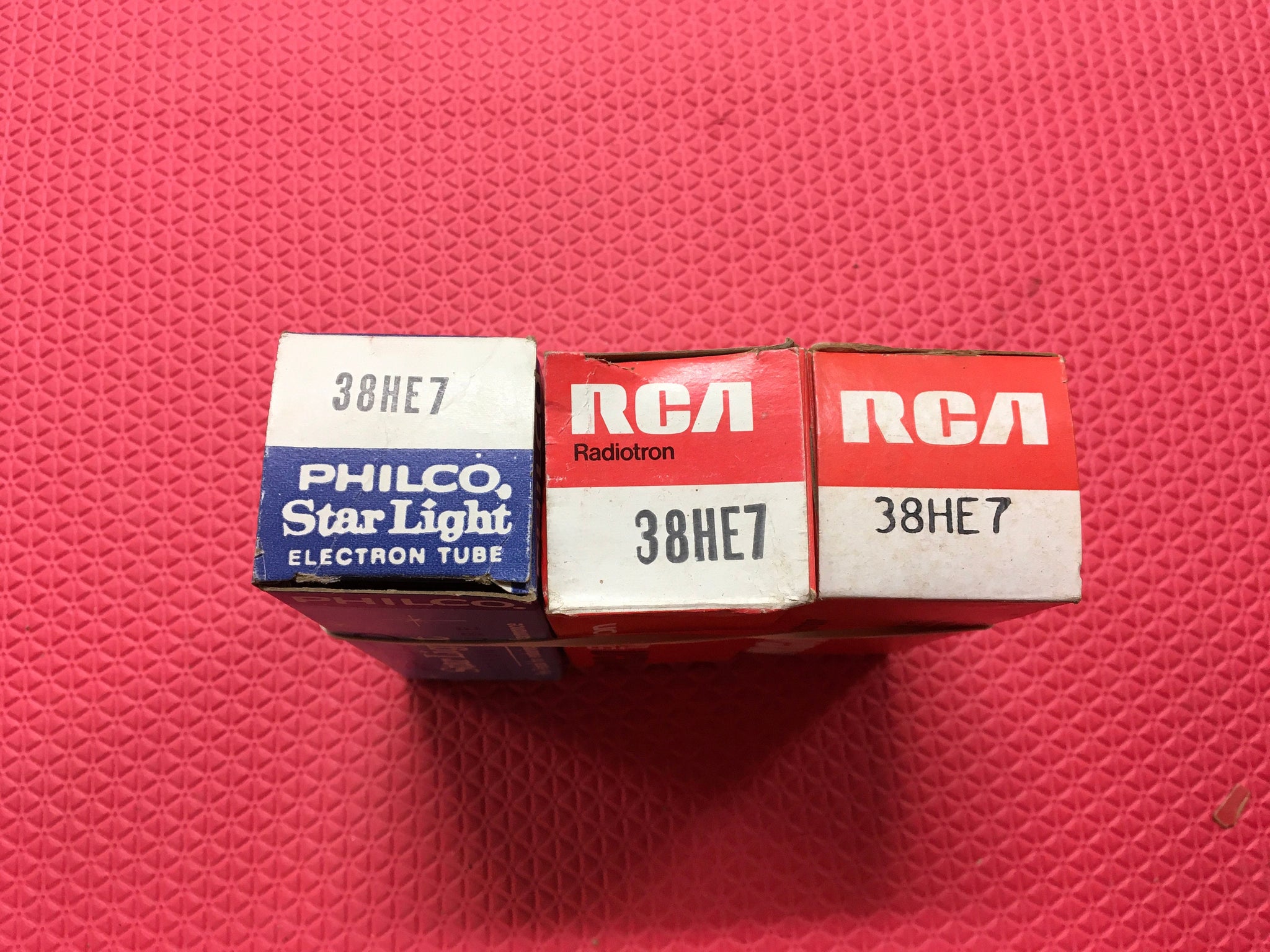 These three new old stock, new in box US-made 38HE7 tubes tested to spec on our Paul Hart-calibrated TV7/U.