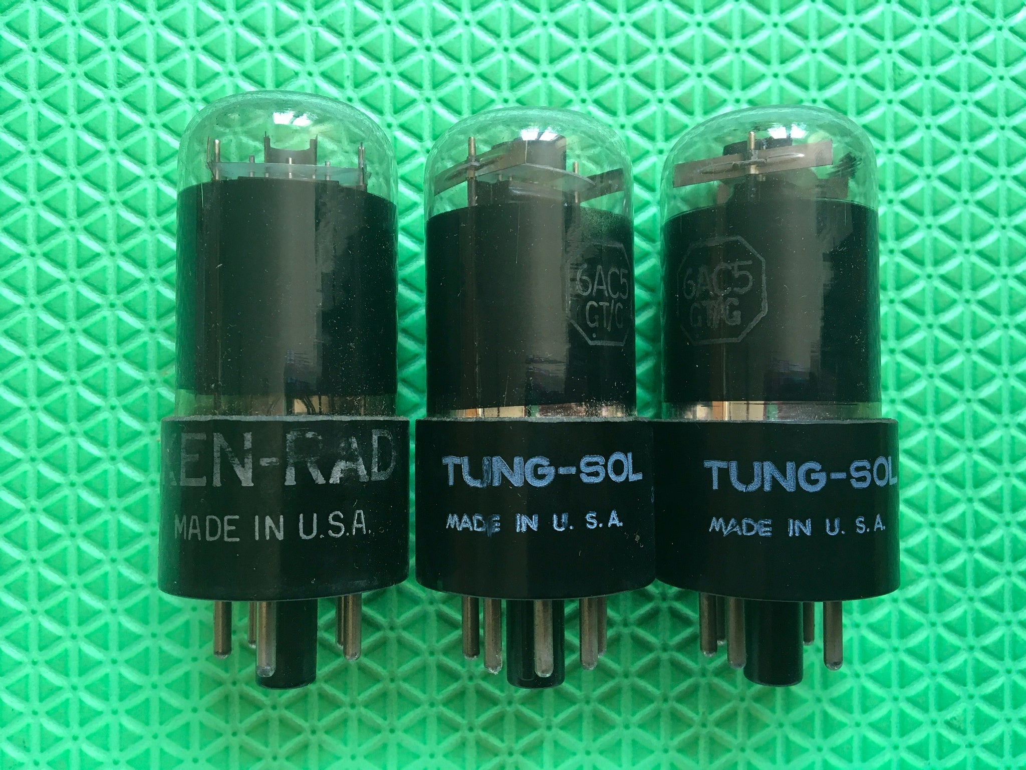 These three new old stock, new in box US-made 6AC5GT tubes tested to spec on our Hickok 800. Two are Tung-Sol and one is Ken-Rad.