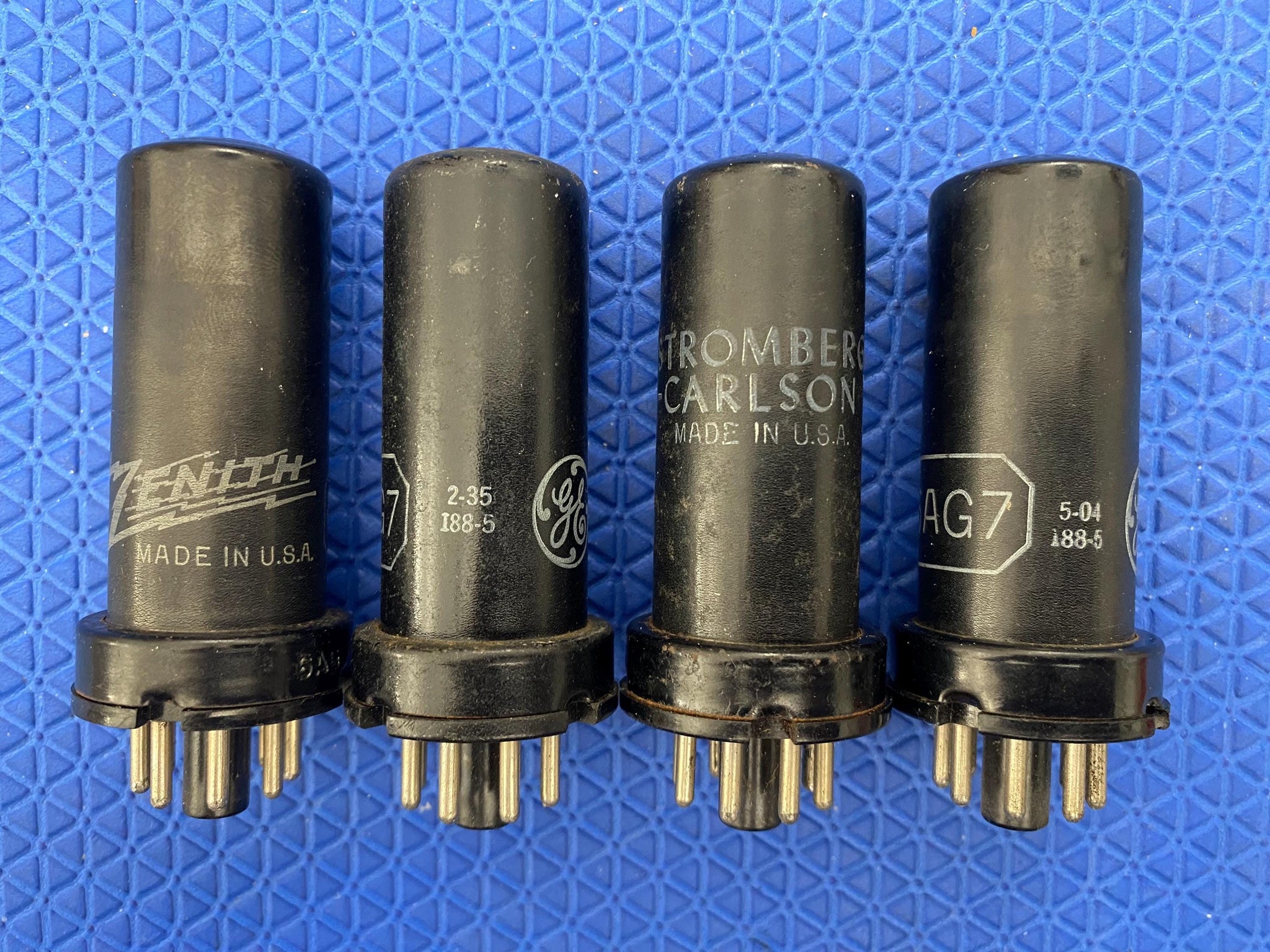 This lot of four GE-MANUFACTURED 6AG7 tubes were tested on our Paul Hart-calibrated TV7/U for shorts, gas and transconductance. There were no shorts or gas.