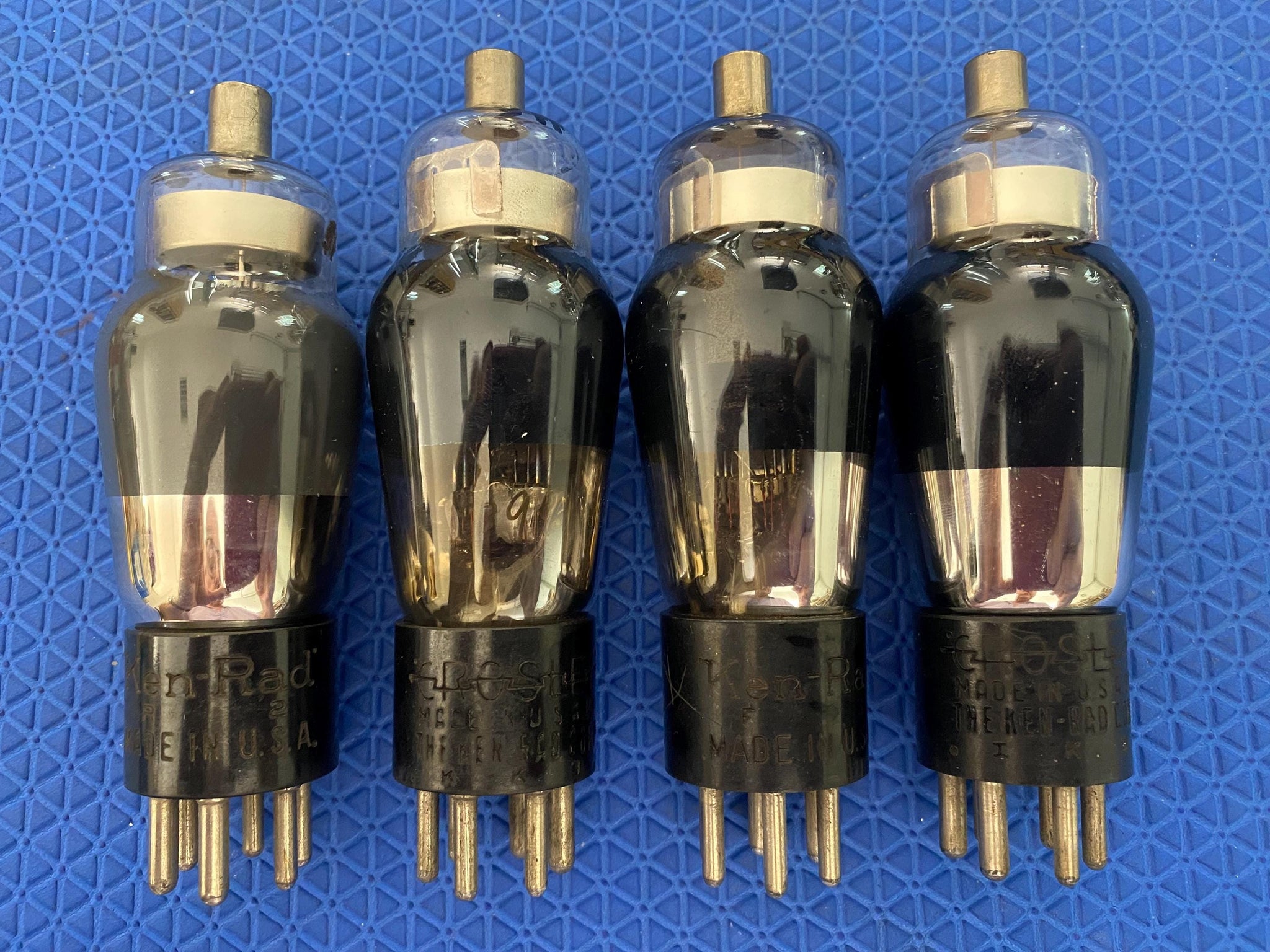 This lot of four Ken-Rad number / type 58 stamped- / engraved-base tubes was tested on our Paul Hart-calibrated TV7/U for shorts, gas and transconductance. There were no shorts or gas and they measured as follows: