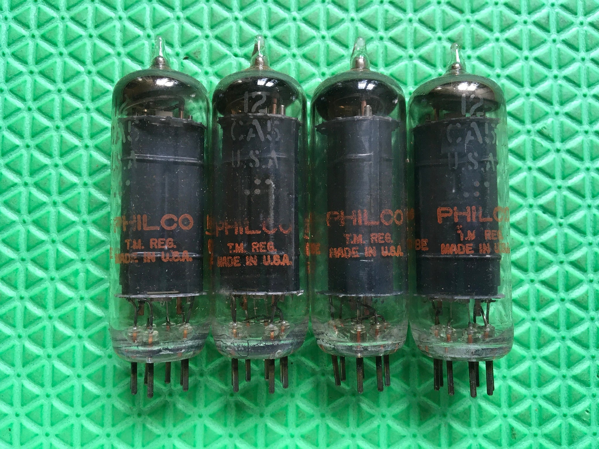 These four new old stock, new in box Philco 12CA5 tubes tested to spec on our Paul Hart-calibrated TV7/U.