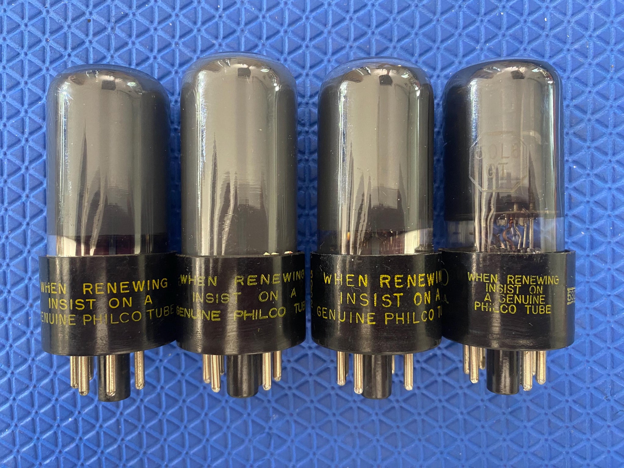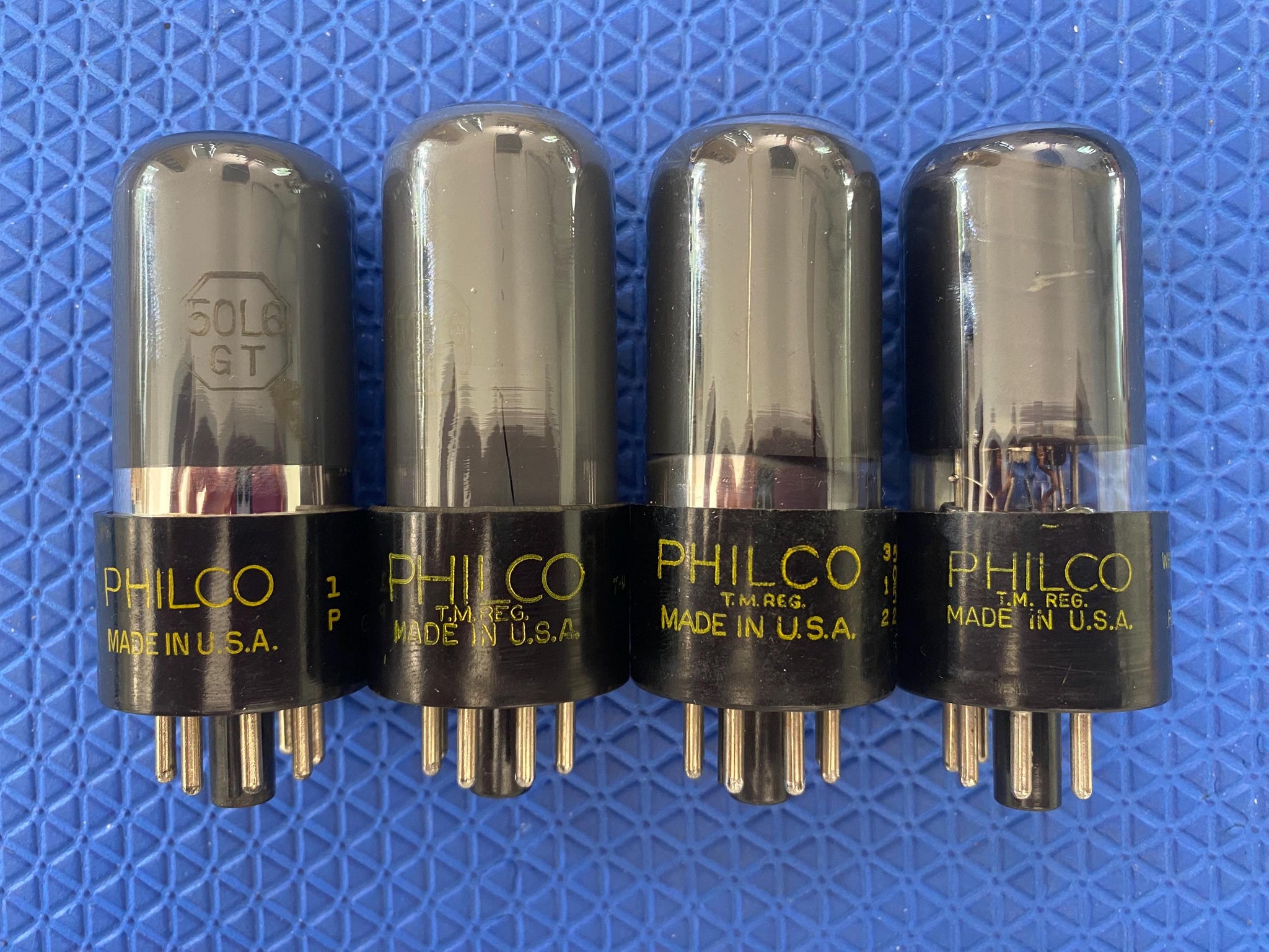 This lot of four Philco coated glass 50L6GT tubes was tested on our Paul Hart-calibrated TV7/U for shorts, gas and transconductance. There were no shorts or gas.