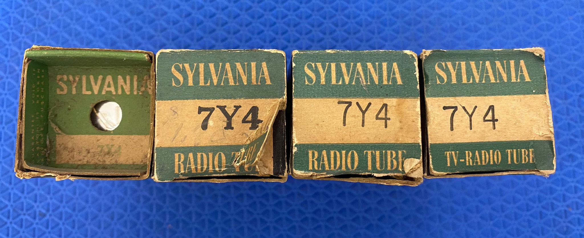 There are four new old stock, new in box Sylvania 7Y4 tubes in this lot. All tested to spec on our Paul-Hart-calibrated TV7/U.