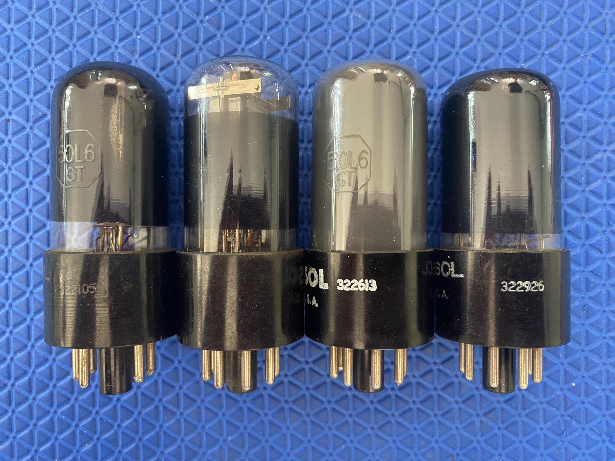 This lot of four Tung-Sol coated glass 50L6GT tubes was tested on our Paul Hart-calibrated TV7/U for shorts, gas and transconductance. There were no shorts or gas.