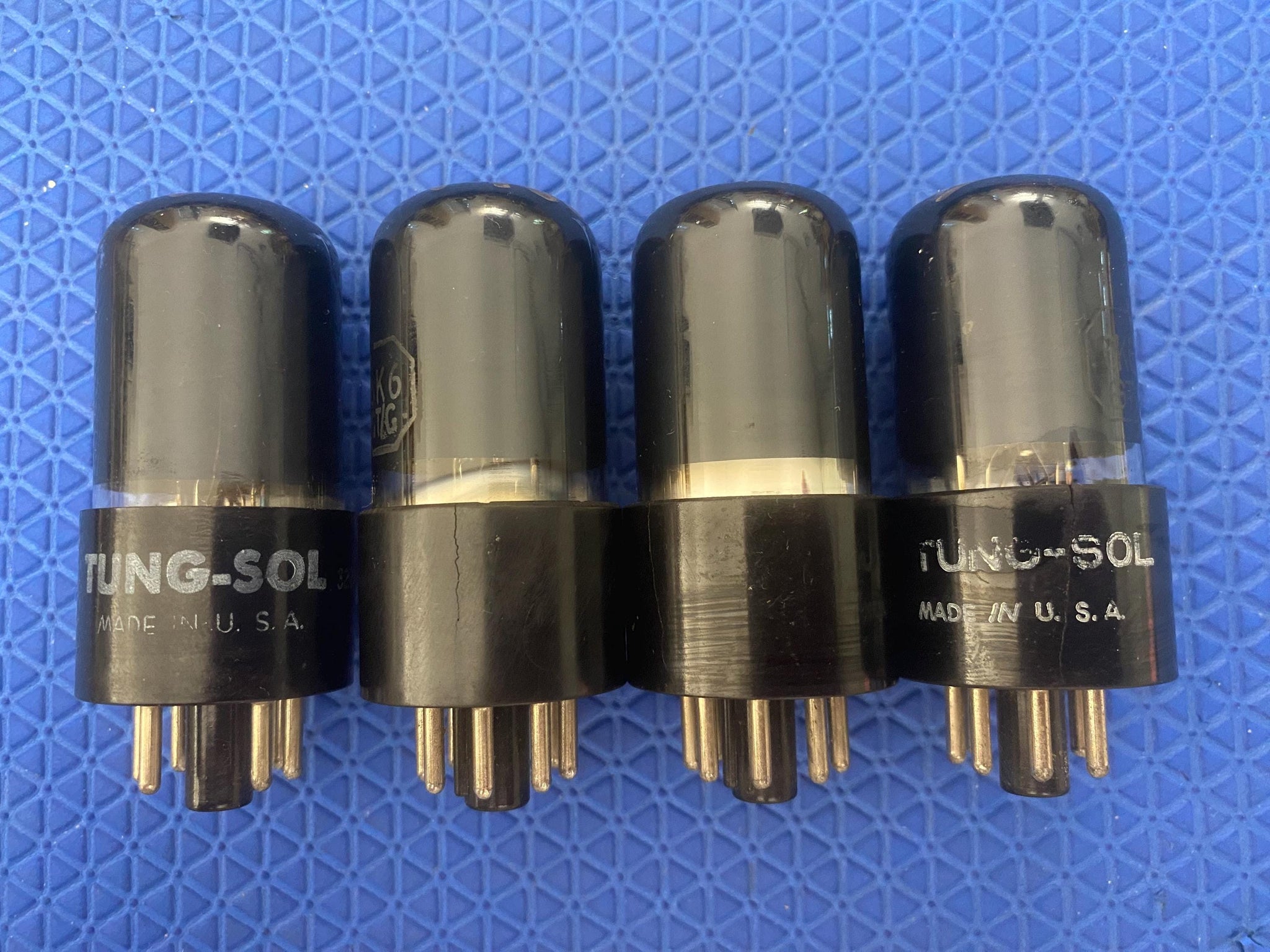 This new old stock-testing lot of six Tung-Sol black glass 6K6GT tubes were tested on our Maxi Matcher 2 with 325 volts on the plates and a bias of --36 volts for shorts, gas, plate current and transconductance. There were no shorts or gas and they measured as follows (from left to right, top to bottom):