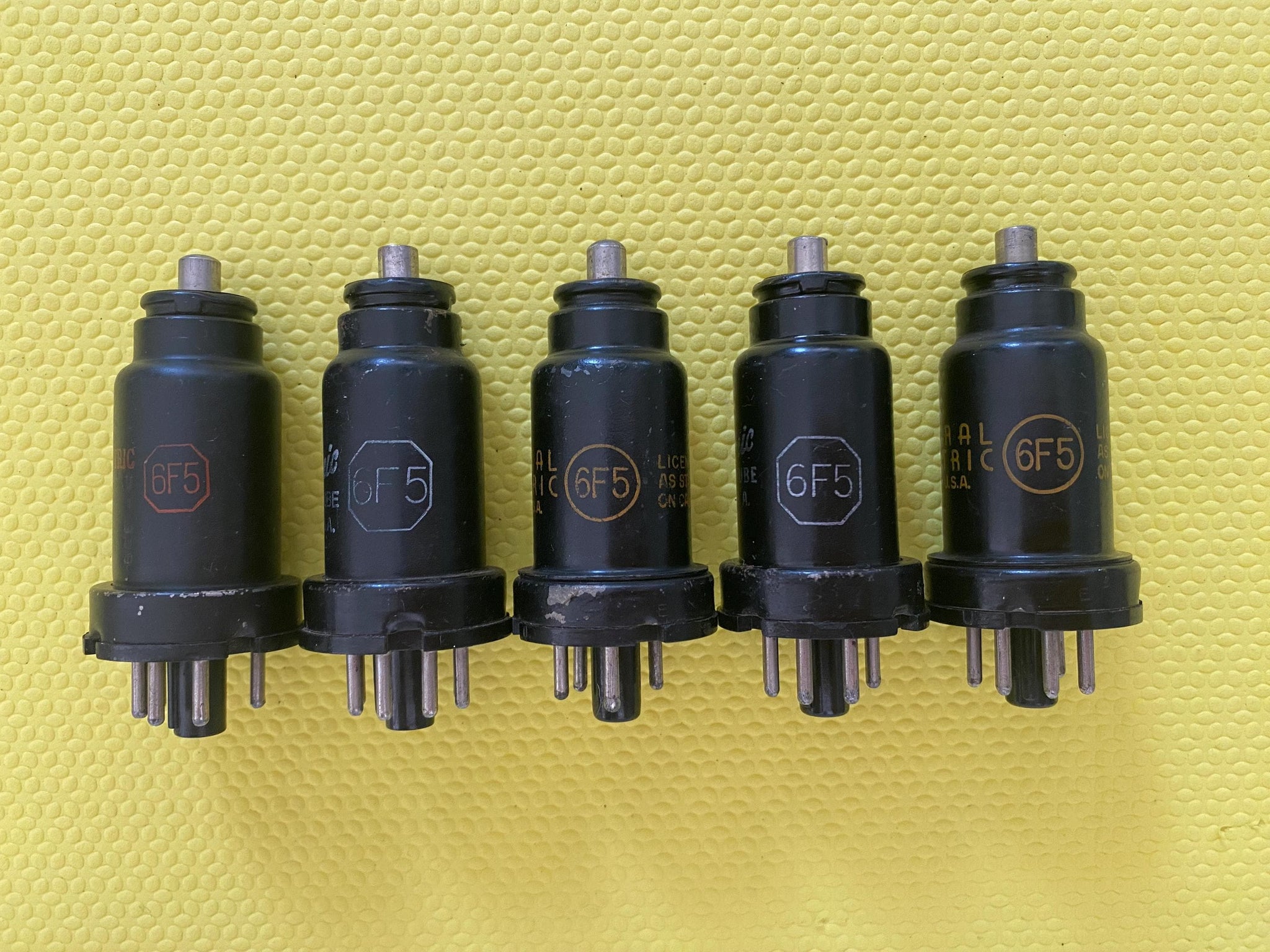 These five GE 6F5s were tested on our Paul Hart-calibrated TV7/U for shorts, gas and transconductance. There were no shorts or gas and they measured as follows: