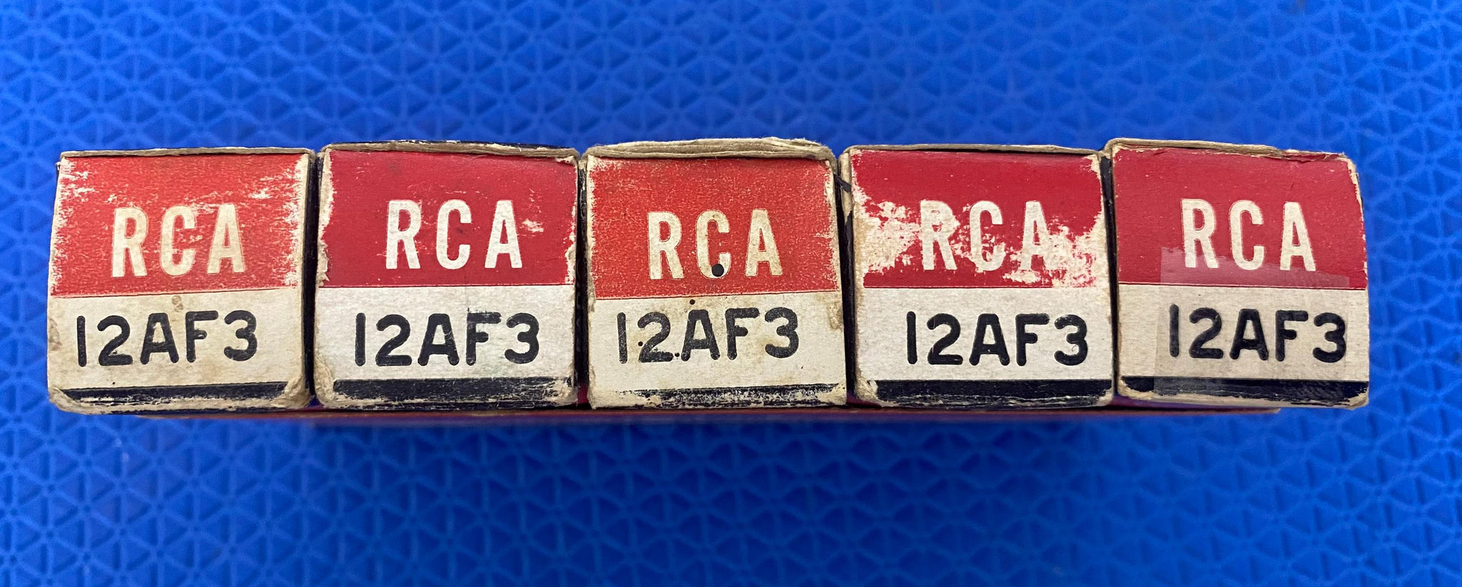 This sleeve of five new old stock, new in box RCA 12AF3 tubes tested to spec on our Paul Hart-calibrated TV7/U.