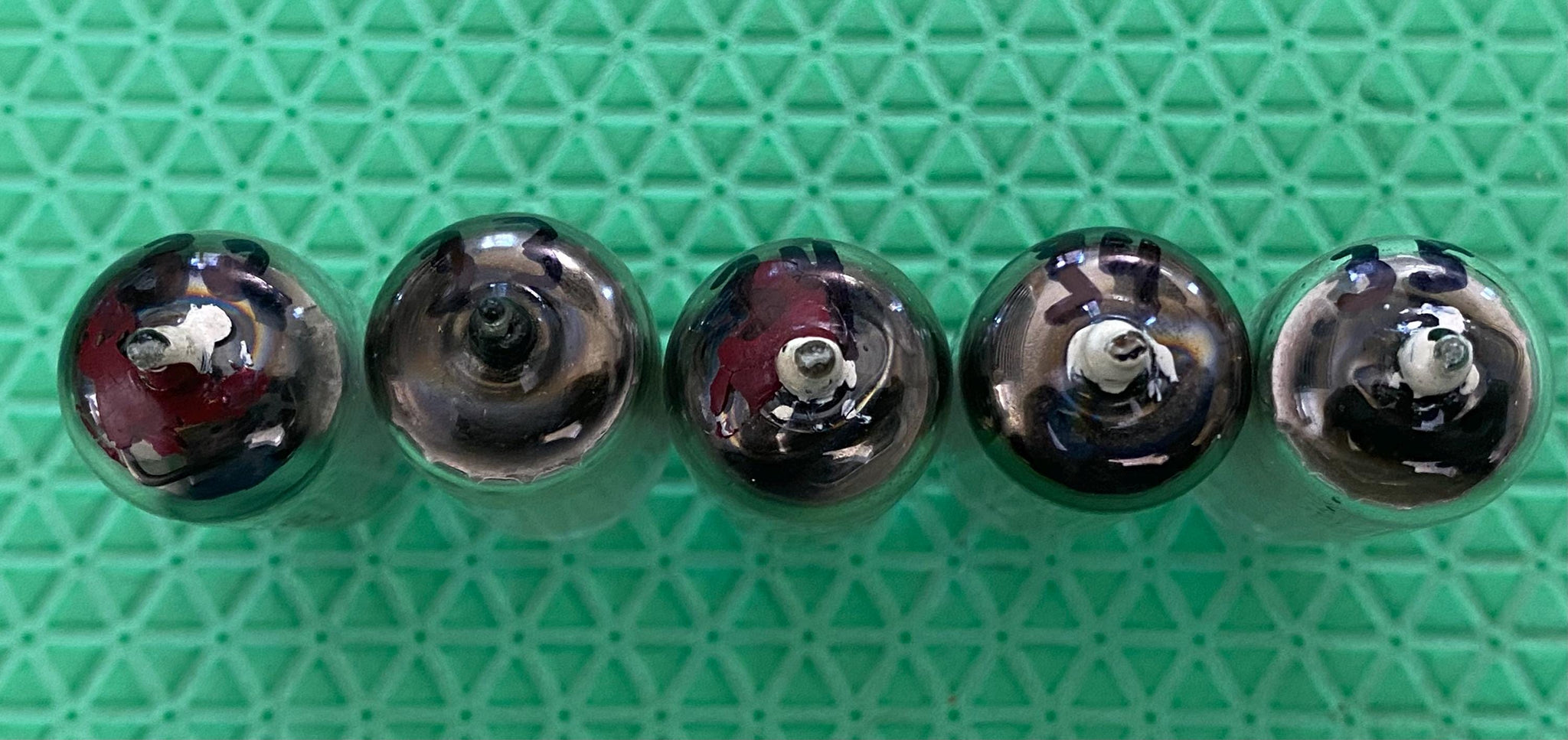 These five US-made 2D21 tubes were tested on our Paul Hart-calibrated TV7/U for shorts, gas and transconductance. There were no shorts or gas and they measured as follows: