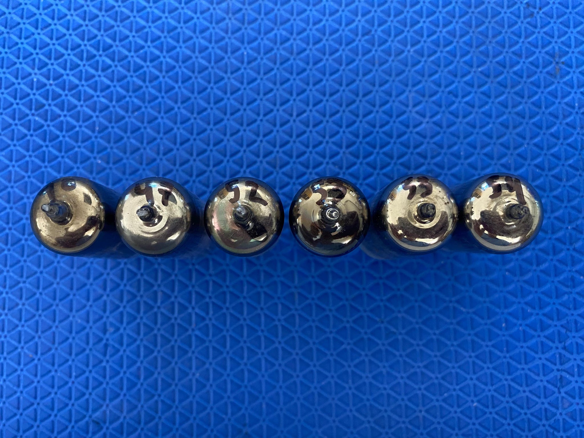 These six gray glass 12BY7 / 12BY7A / 12BV7 tubes tested as follows on our Paul Hart-calibrated TV7/U where minimum (65%) is 46:
