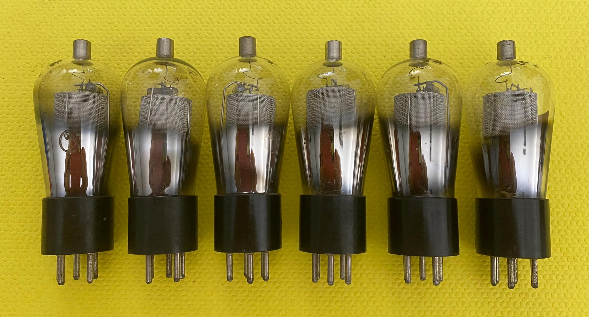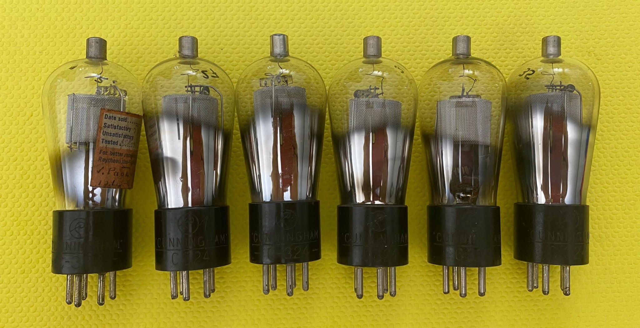 These six Cunningham C-324 globe, mesh plate tubes tested 20, 27, 30, 30, 32 and 35 on our Paul Hart-calibrated TV7/U where minimum (65%) is 25.