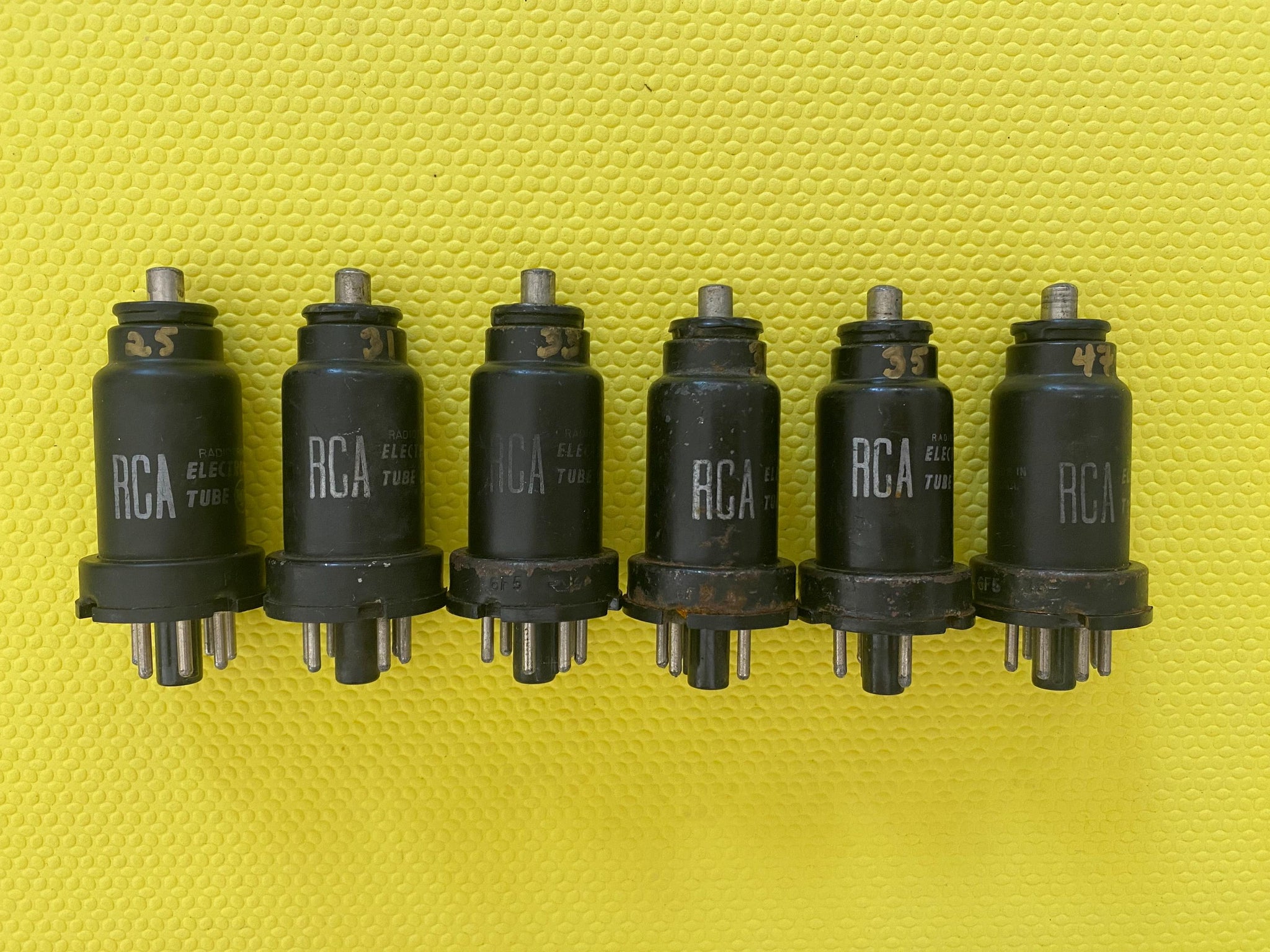 These Six RCA small logo 6F5s were tested on our Paul Hart-calibrated TV7/U for shorts, gas and transconductance. There were no shorts or gas and they measured as follows: