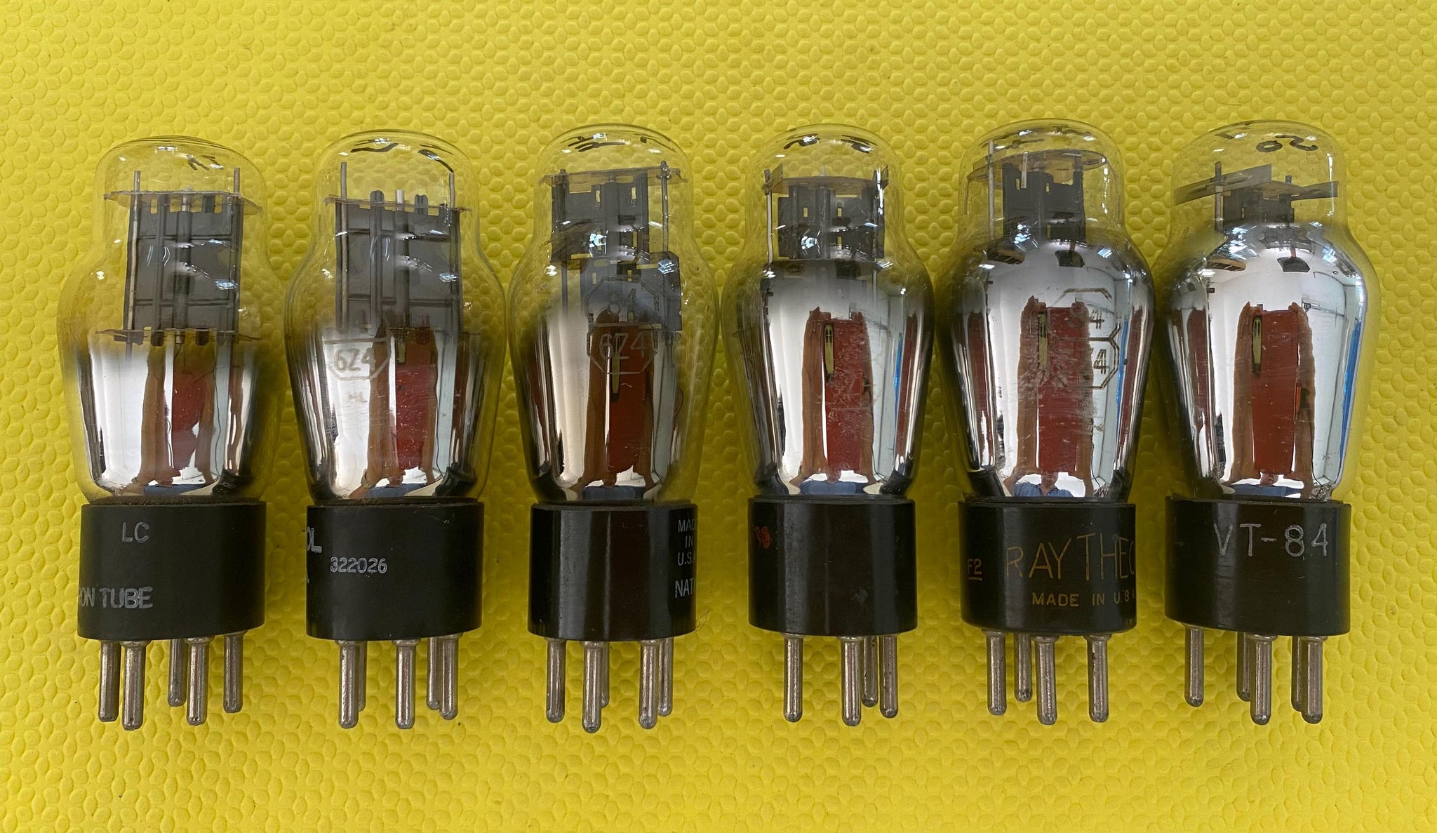 These six US-made 84 / 6Z4 rectifier tubes were tested on our Paul Hart-calibrated TV7/U for shorts, gas and emissions. There were no shorts or gas.