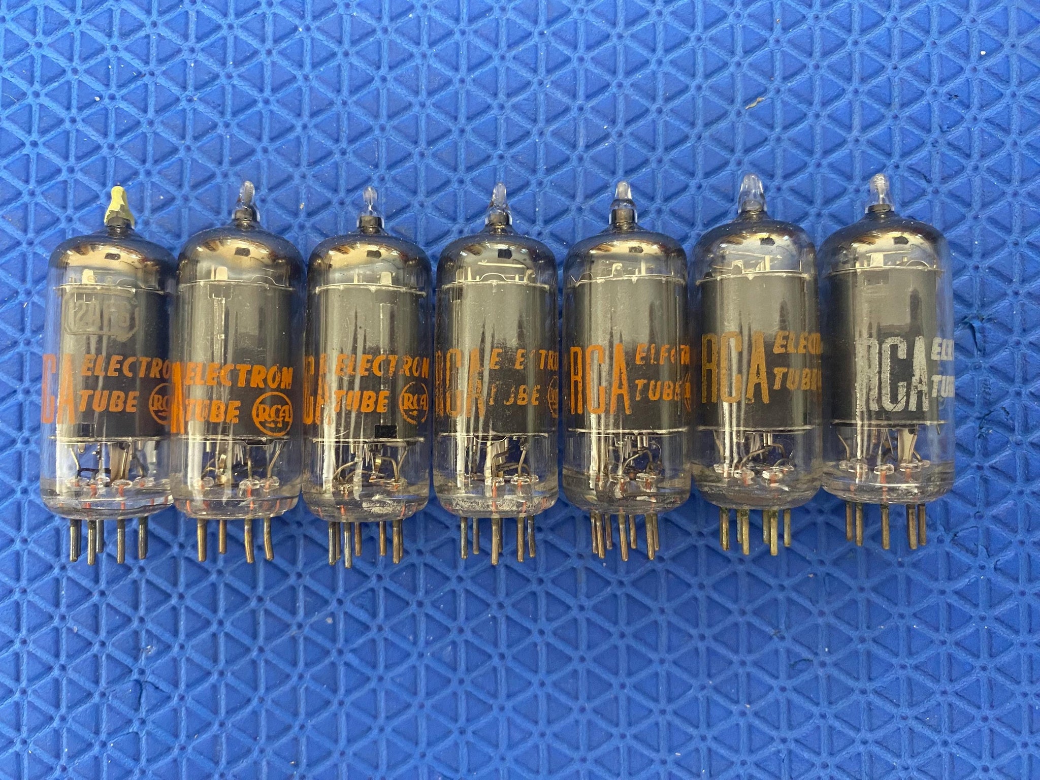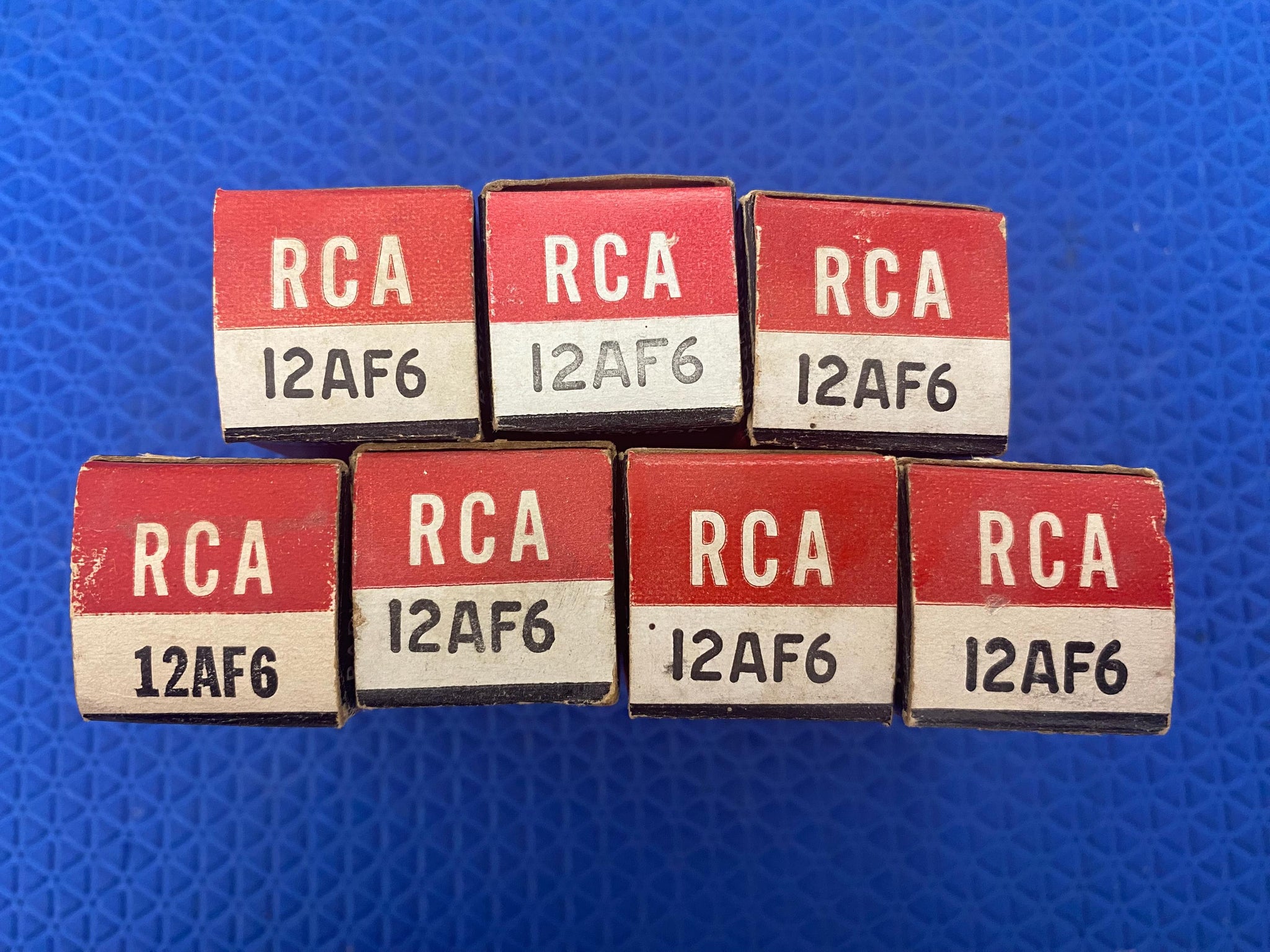 This lot of seven new old stock, new in box RCA 12AF6 tubes tested to spec on our Paul Hart-calibrated TV7/U.