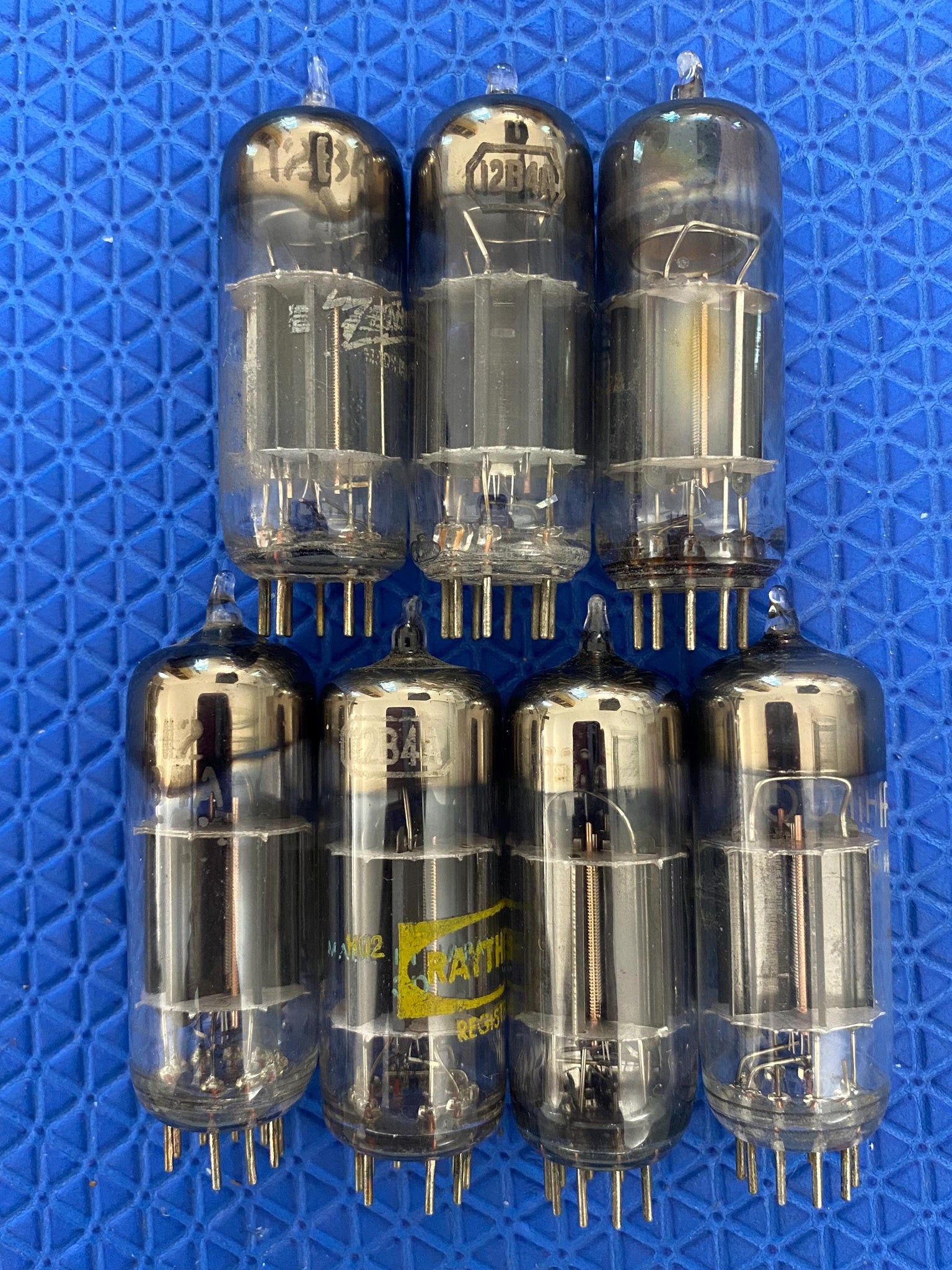 This lot of seven US-made 12B4A tubes were tested on our Paul Hart-calibrated TV7/U for shorts, gas and transconductance. There were no shorts or gas.