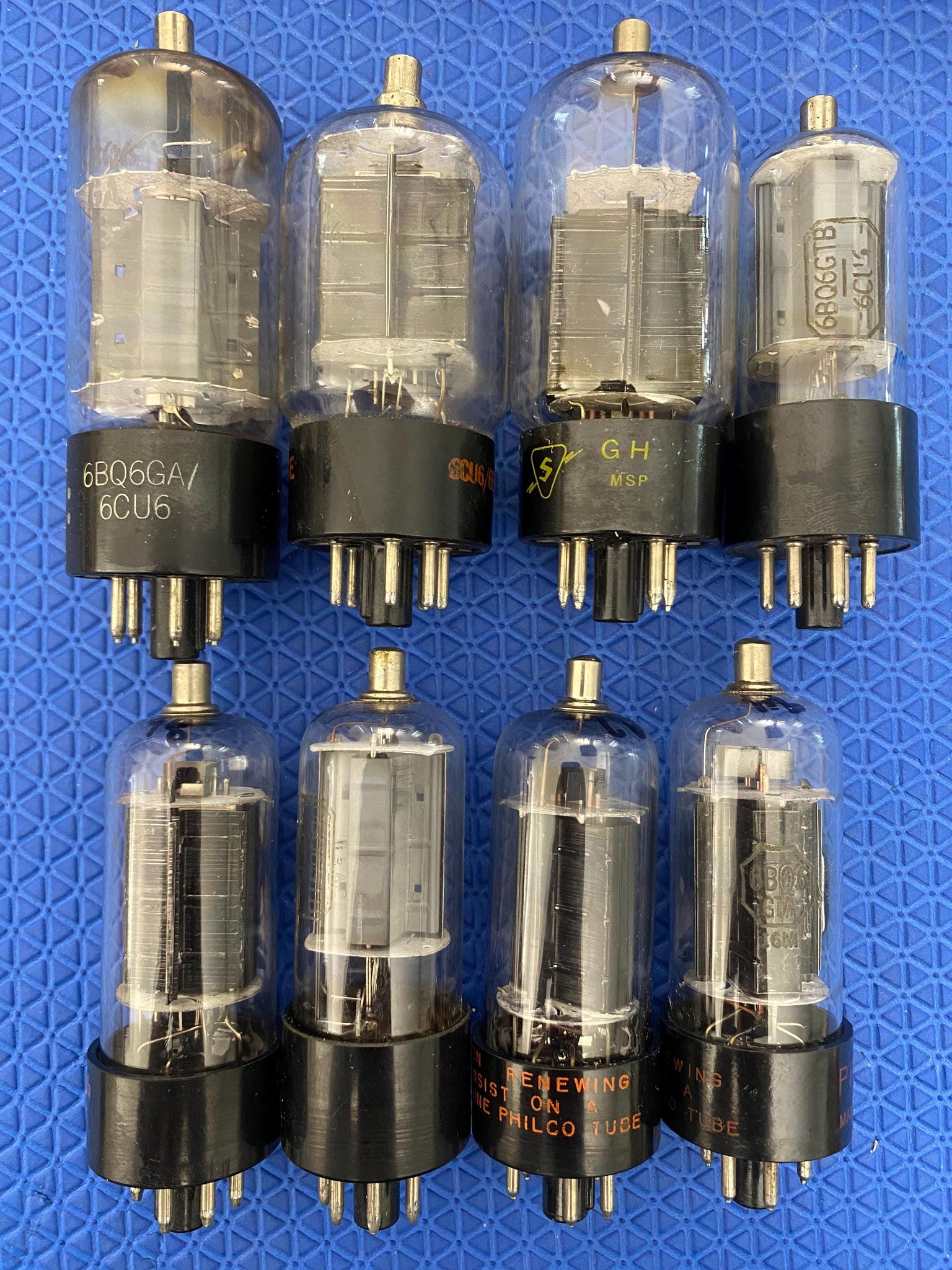 These eight US-made 6BQ6 / 6CU6 tubes tested as follows on our Paul Hart-calibrated TV7/U: