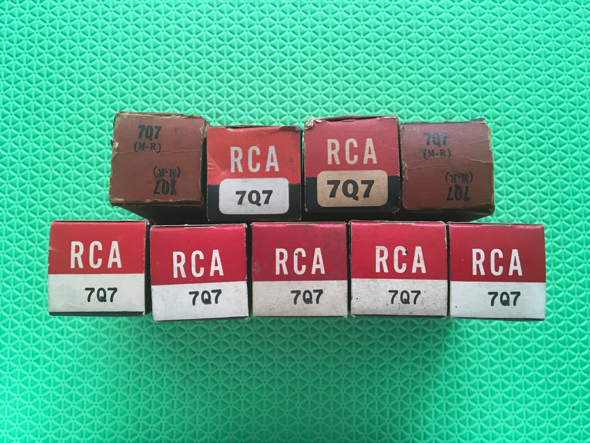 These nine new old stock, new in box RCA 7Q7 tubes tested to spec on our Paul Hart-calibrated TV7/U.