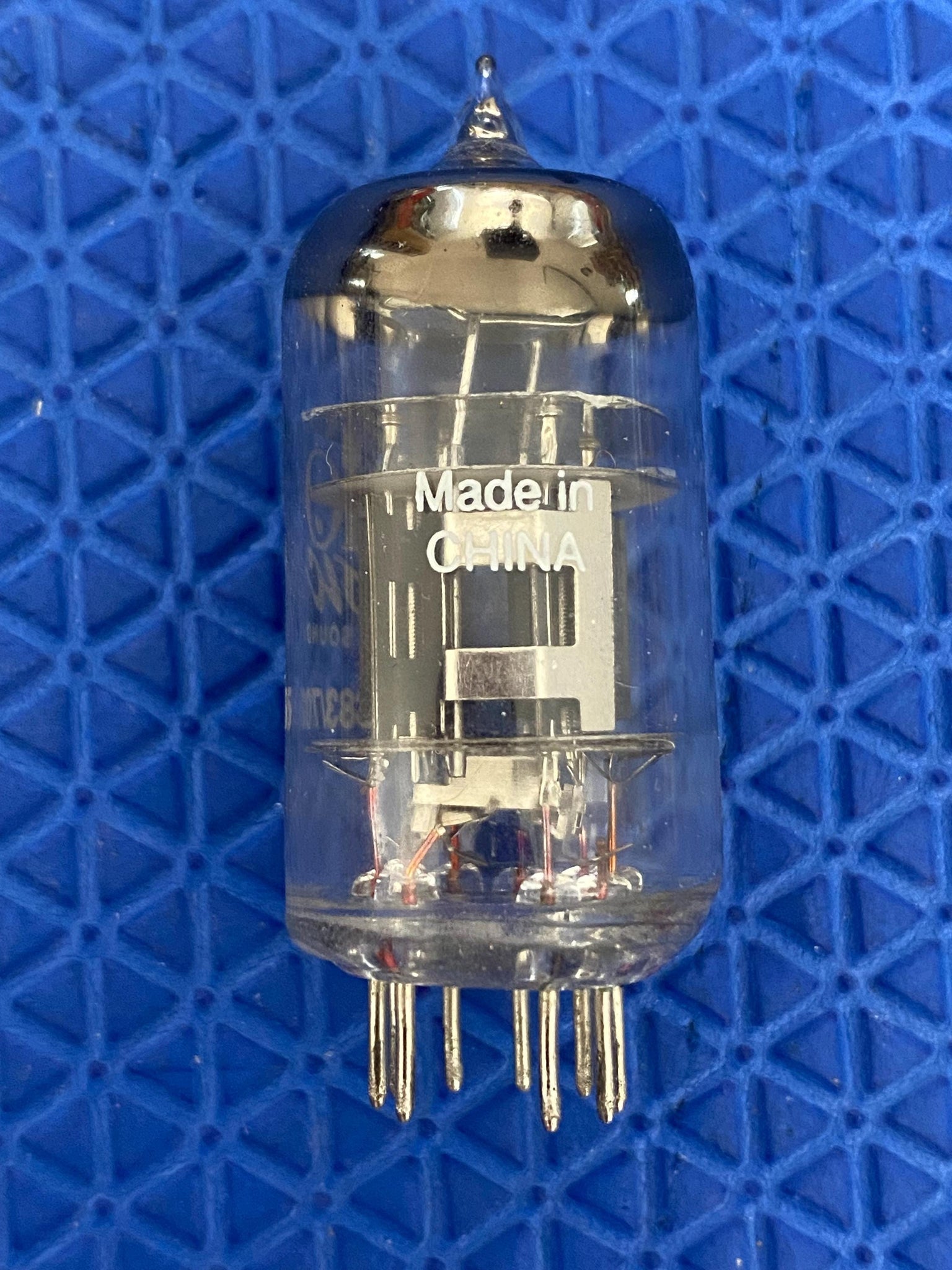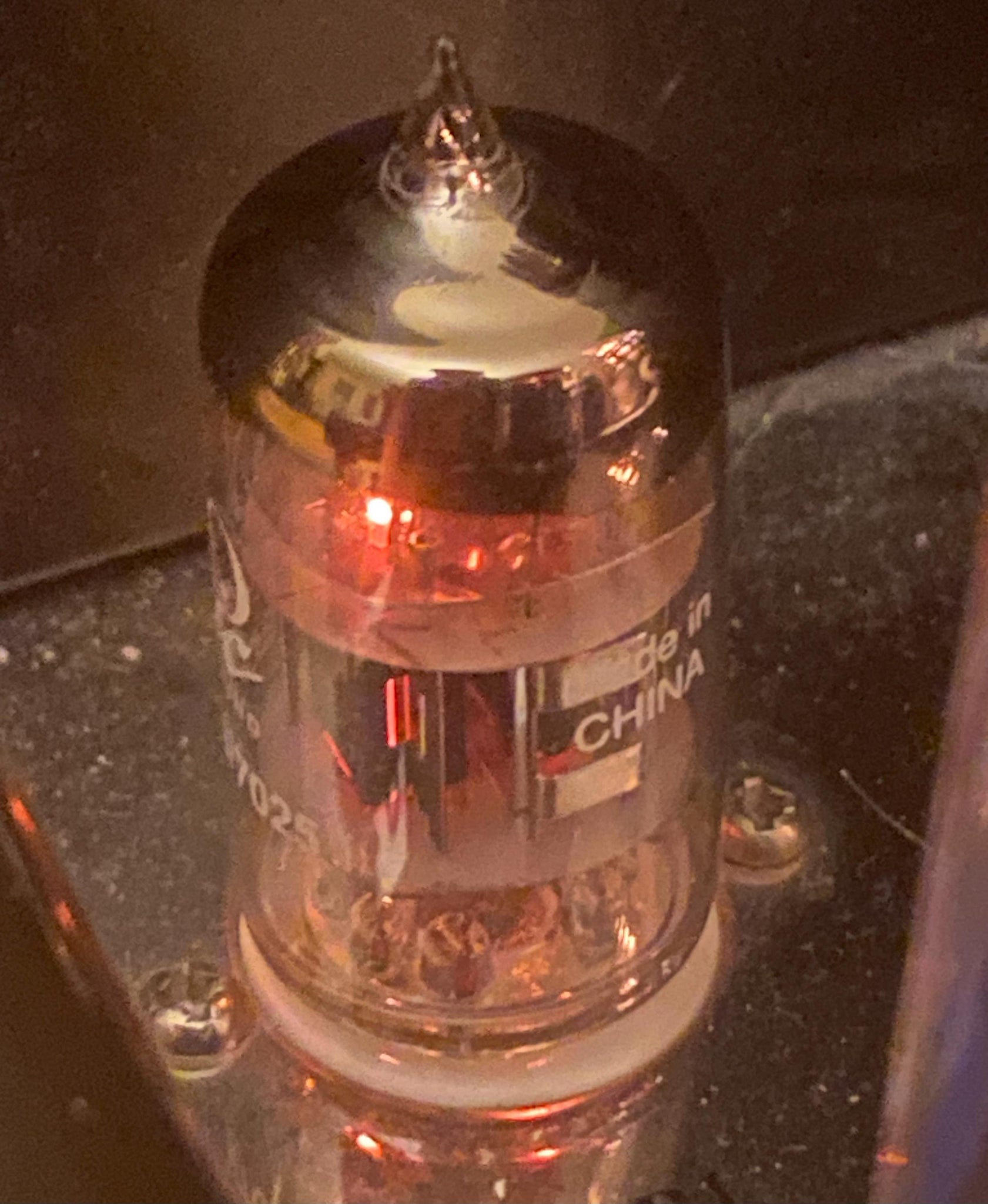 It has outstanding silkscreening; a third mica spacer for increased vibration resistance and lowered microphonics; was made in China; has excellent flashing and a foil getter.