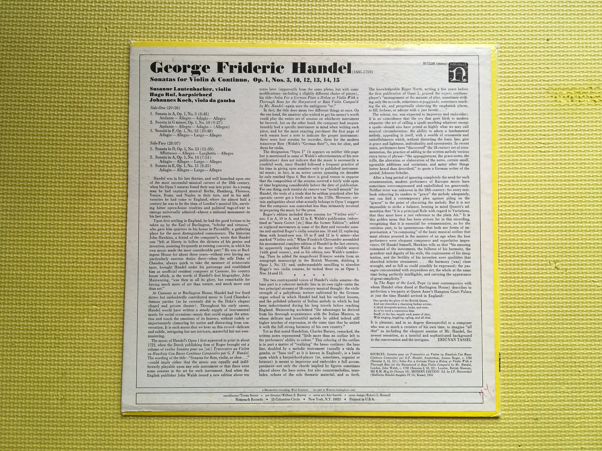 George Frideric Handel Sonatas For Violin & Concertino Opus 1 3 10 12 13 14 15A Stereo Nonesuch H-71238