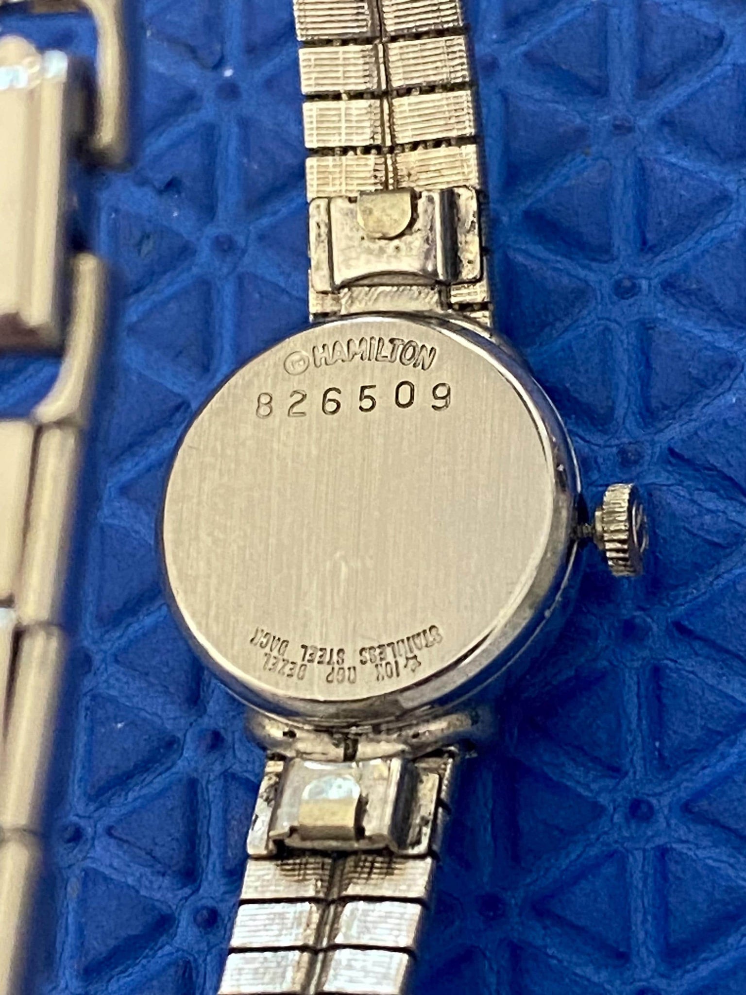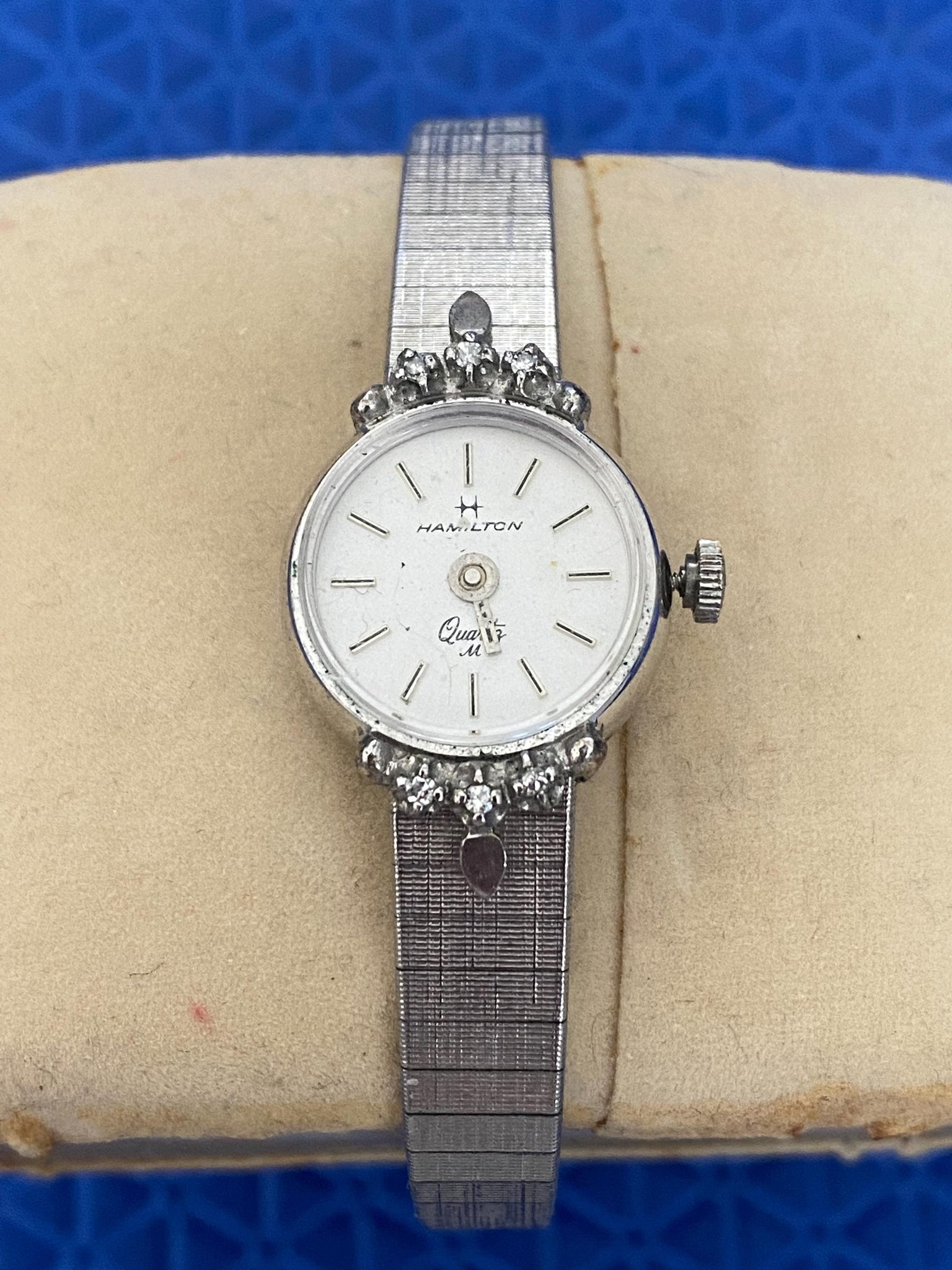 This Hamilton quartz ladies' watch doesn't work and is missing its hour hand. One can adjust the time, but the stem will not return to Position One. It will need to be serviced.