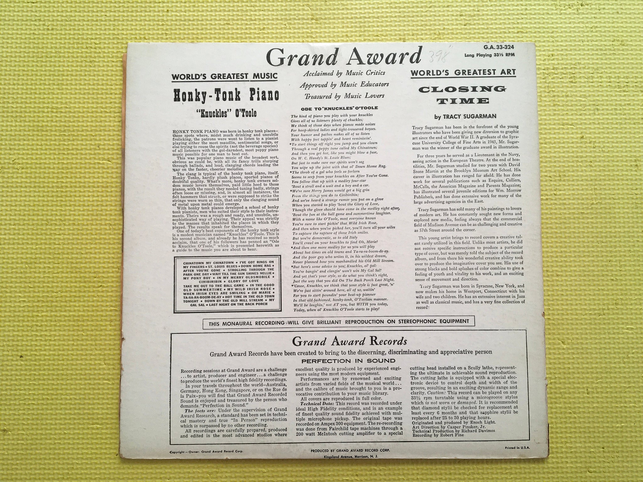 Knuckles O'Toole Plays Honky Tonk Piano Volume 2 Mono LP Grand Award Record Corp GA-33-324