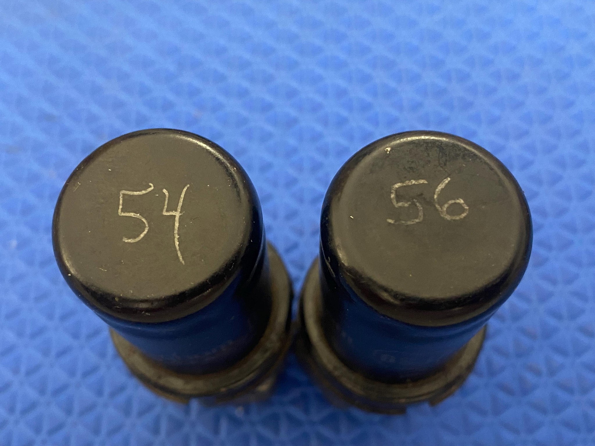 Transconductance measured 54 for Tube One and 56 for Tube Two where minimum (65%) is 40 and 100% is 62.