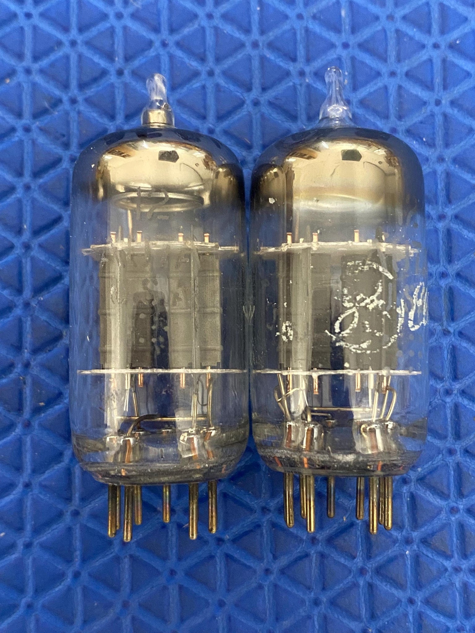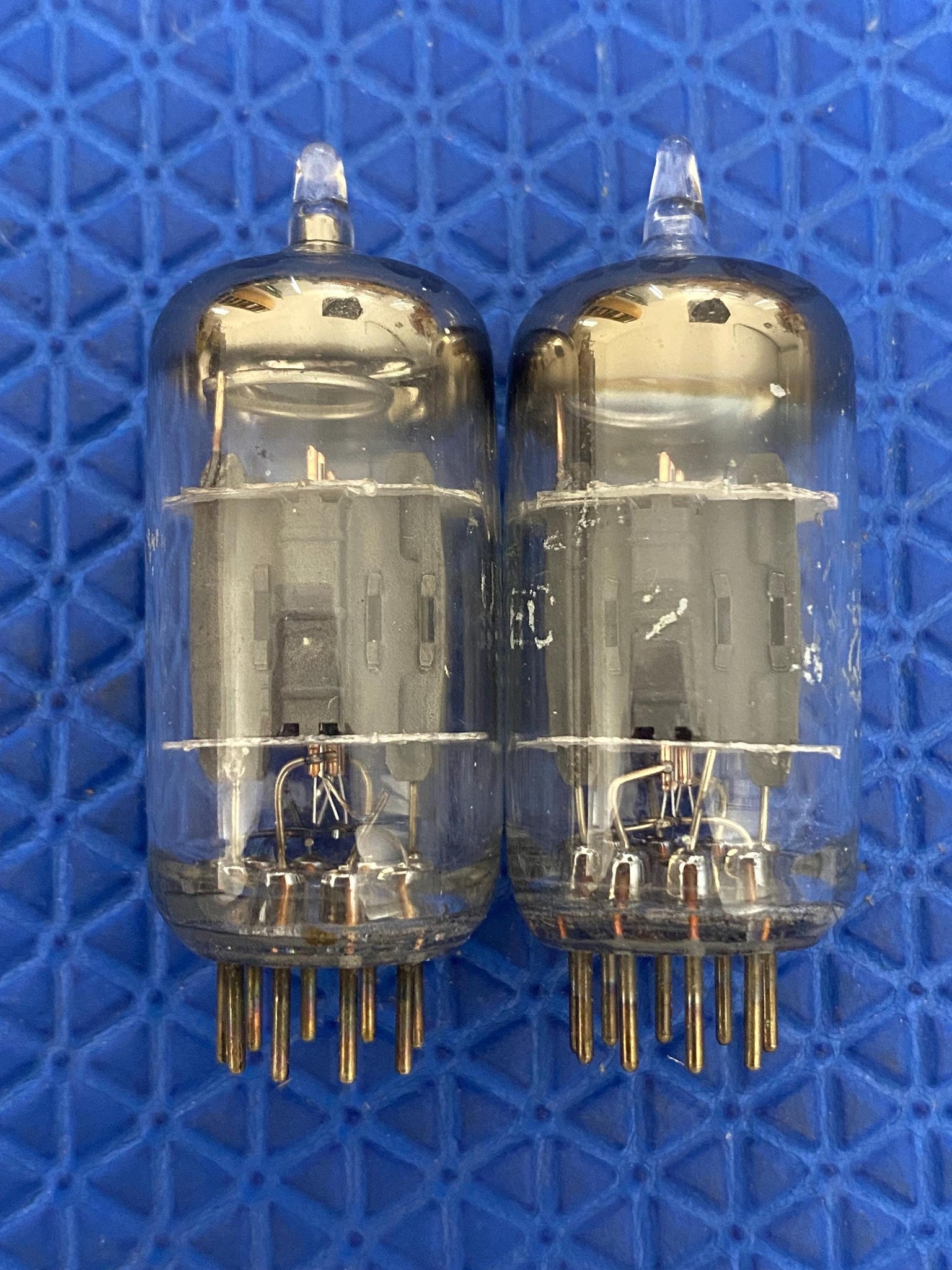 This matched pair of General Electric 12AU7/ECC82 dual triodes was tested on our Hickok 600A for shorts, gas and transconductance. There were no shorts or gas.