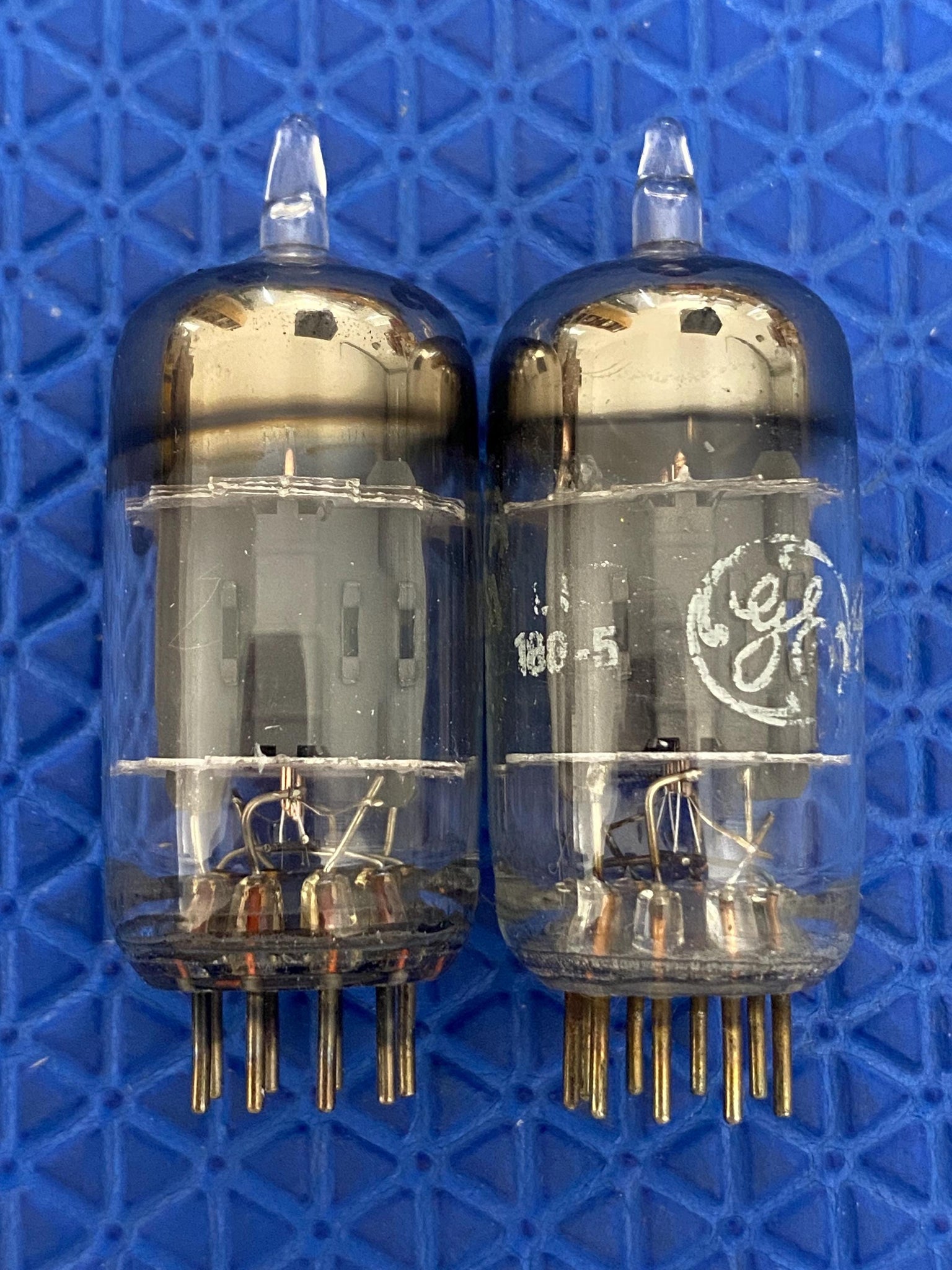 This matched pair of General Electric 12AU7A / ECC82 dual triodes was tested on our Hickok 600A for shorts, gas and transconductance. There were no shorts or gas.