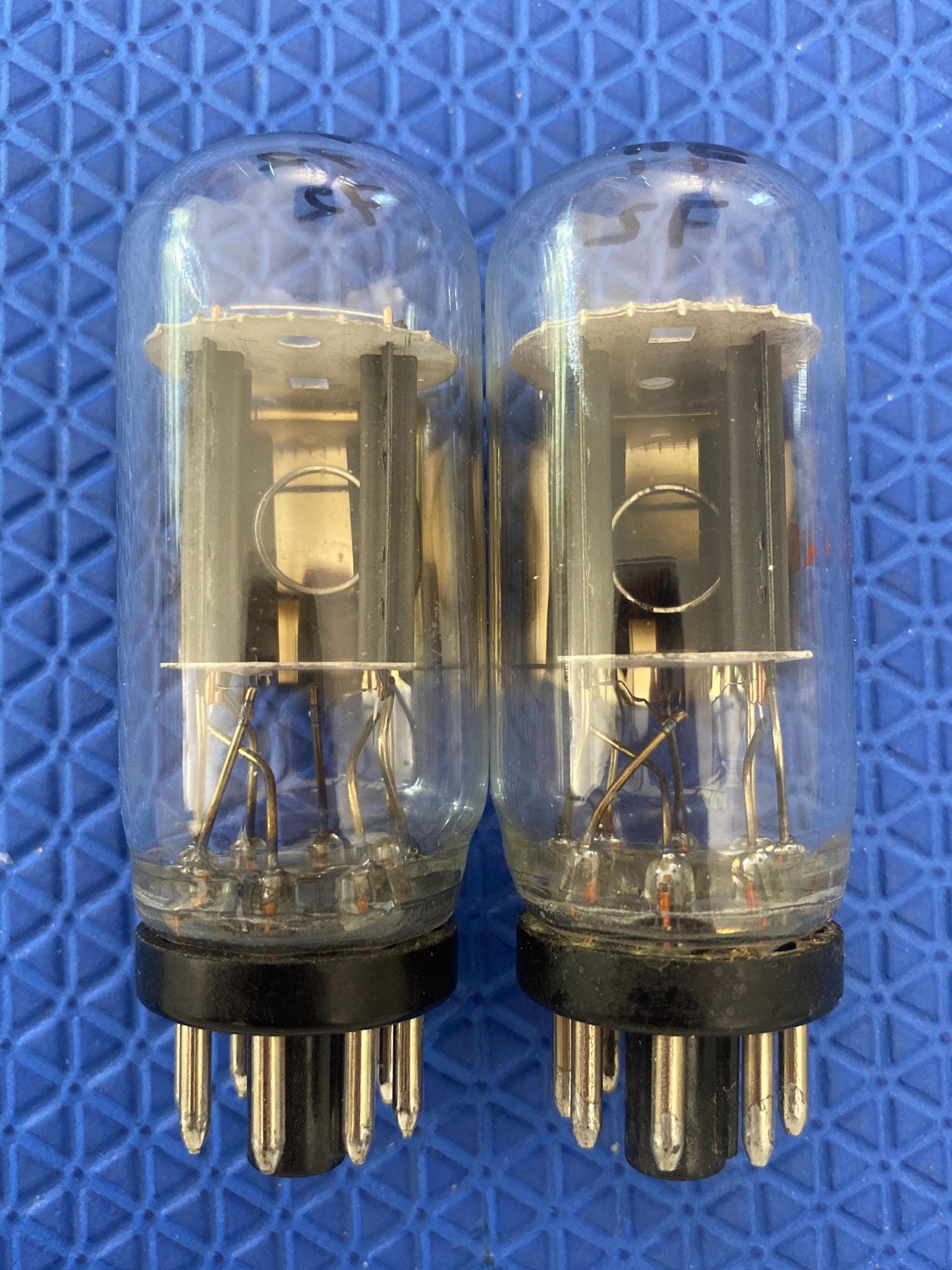 They have additional filaments across the top tube for an enhanced light show; side O getters; coin bases; copper support rods; a round and square hole in each mica spacer; great flashing and FM and HH date codes.