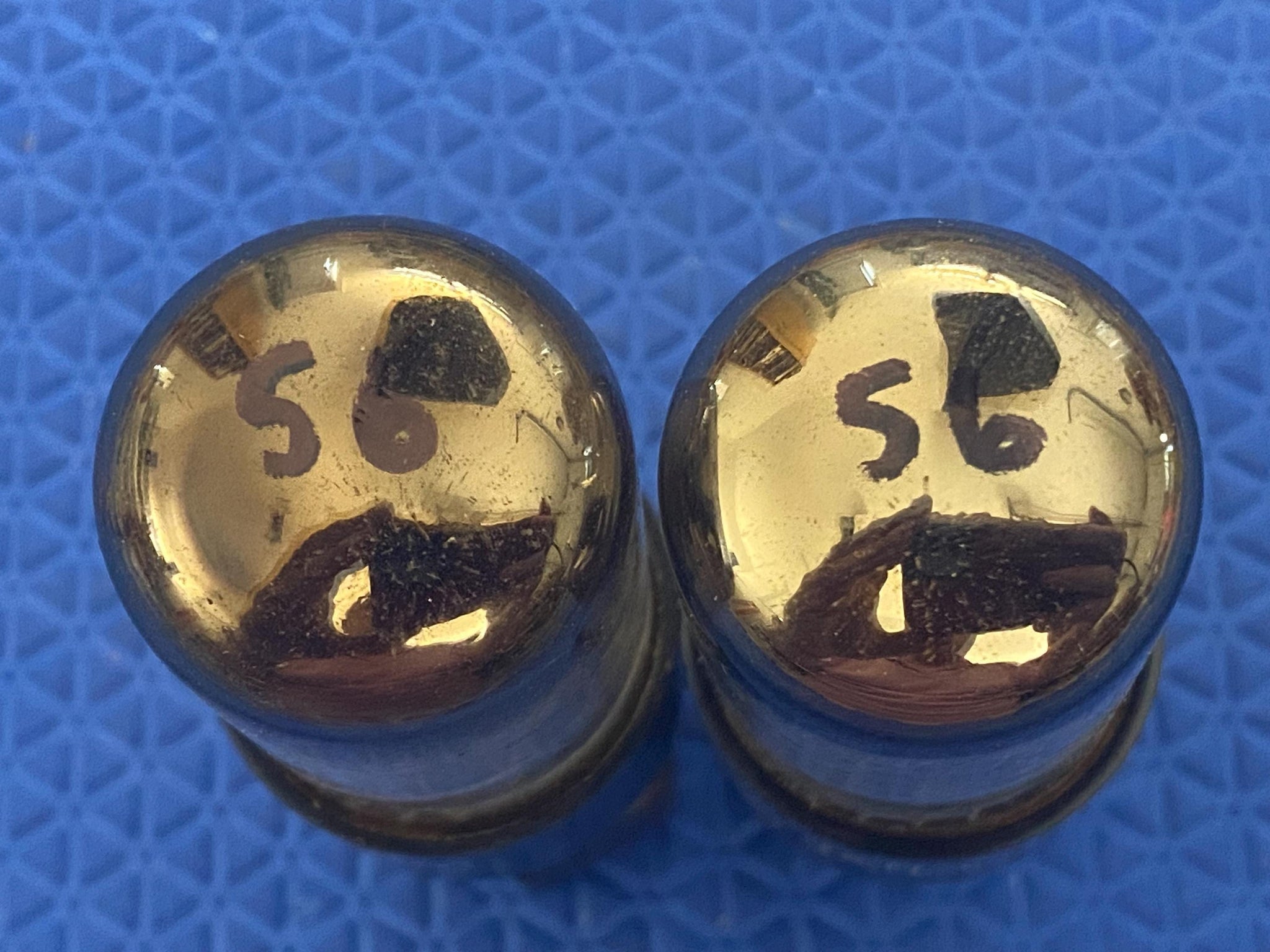 This matched pair of new old stock, new in box milspec black plate GE 6Y6GT / JAN-CG-6Y6GT tubes both tested 56 on our Paul Hart-calibrated TV7/U where minimum (65%) is 40 and 100% is 62.