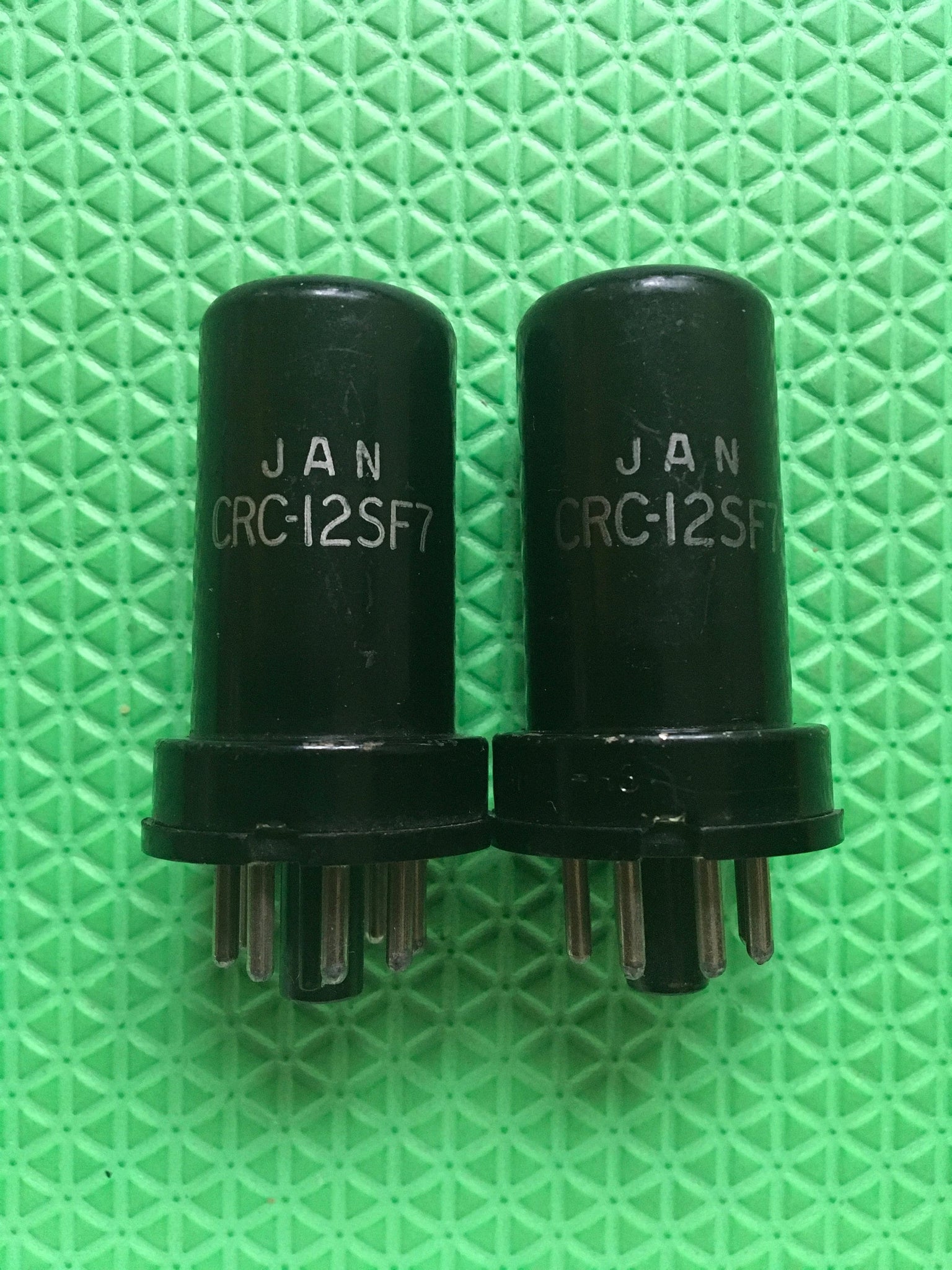 This new old stock-testing matched pair of RCA milspec JAN-CRC-12SF7 / 12SF7 tubes was tested on our Paul Hart-calibrated TV7/U for shorts, gas and transconductance. There were no shorts or gas.