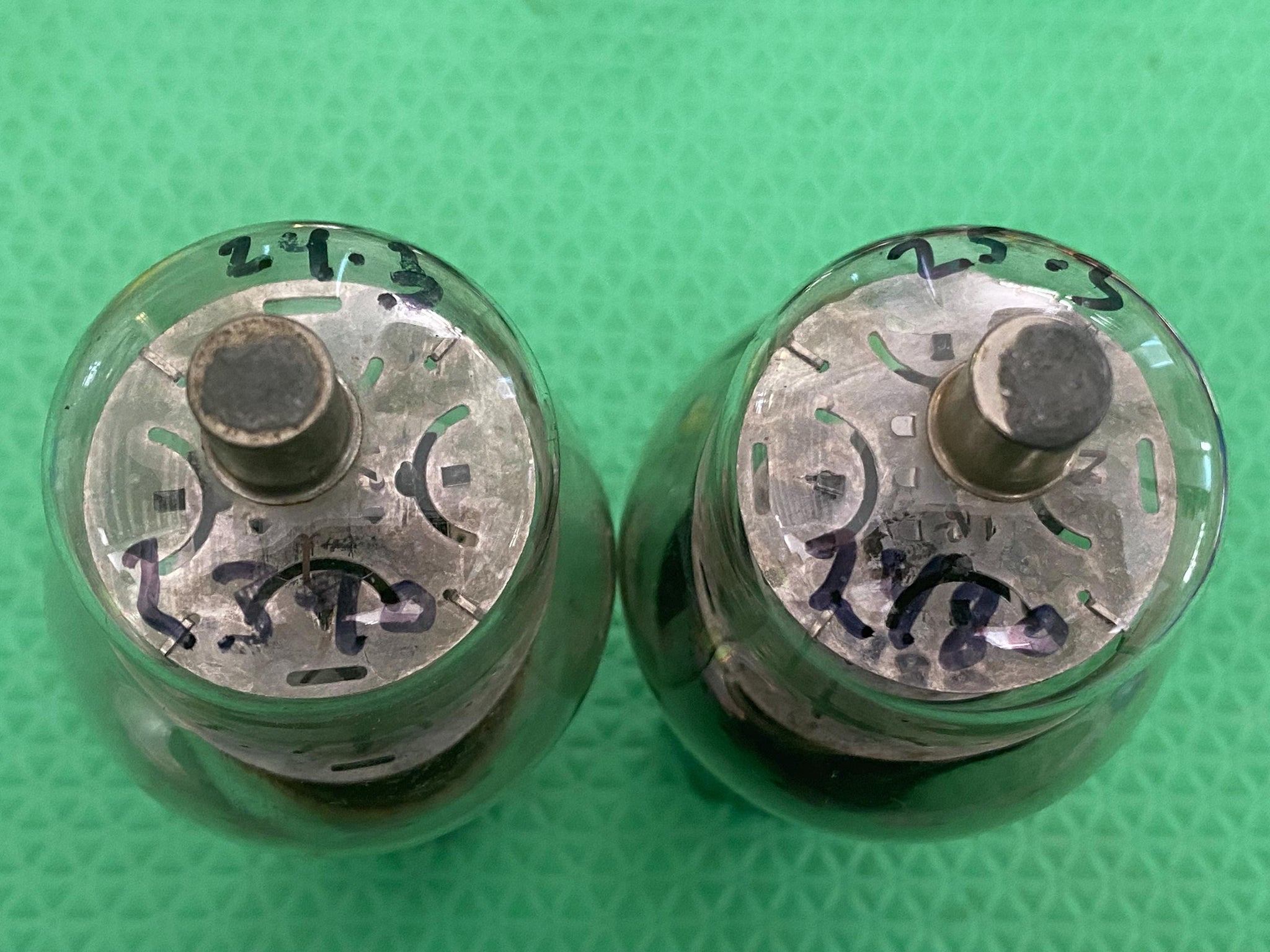 These tubes have nifty shoulder / Coke bottle glass envelopes; mica snubbers; black plates; side, double-D getters and anode radiators for cooler operation and longer life. Please note that the bottle of Tube One has been re-cemented to its base and some of the original cement is loose in the base itself. As long as the tubes are not being used in a guitar amplifier, things will be fine.