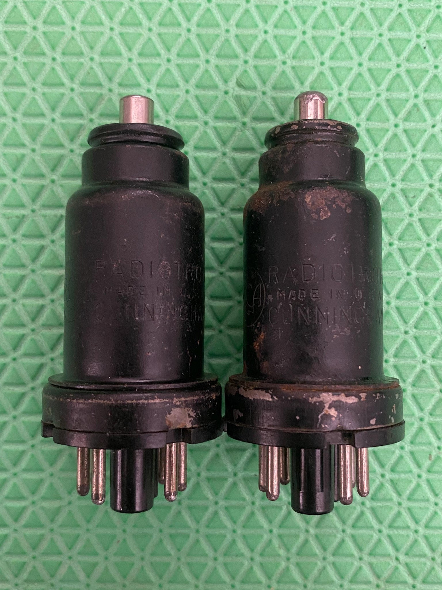 This new old stock-testing, perfectly-matched pair of RCA-Cunningham 6K7 tubes were tested on our Paul Hart-calibrated TV7/U for shorts, gas and transconductance. There were no shorts or gas.