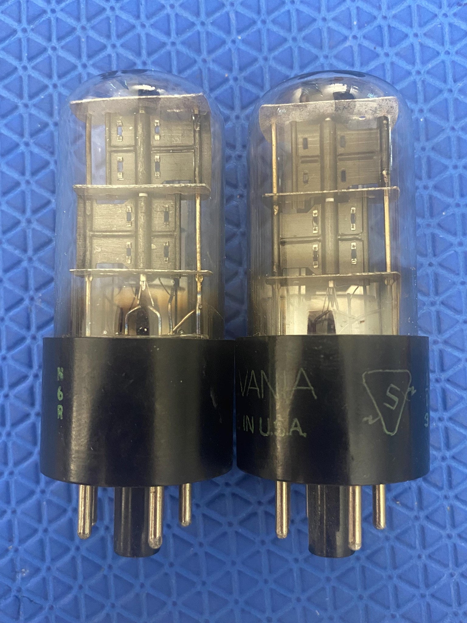 This matched pair of Sylvania 6X5GT rectifier tubes was tested on our Paul Hart-calibrated TV7/U for shorts, gas and emissions. There were no shorts or gas.