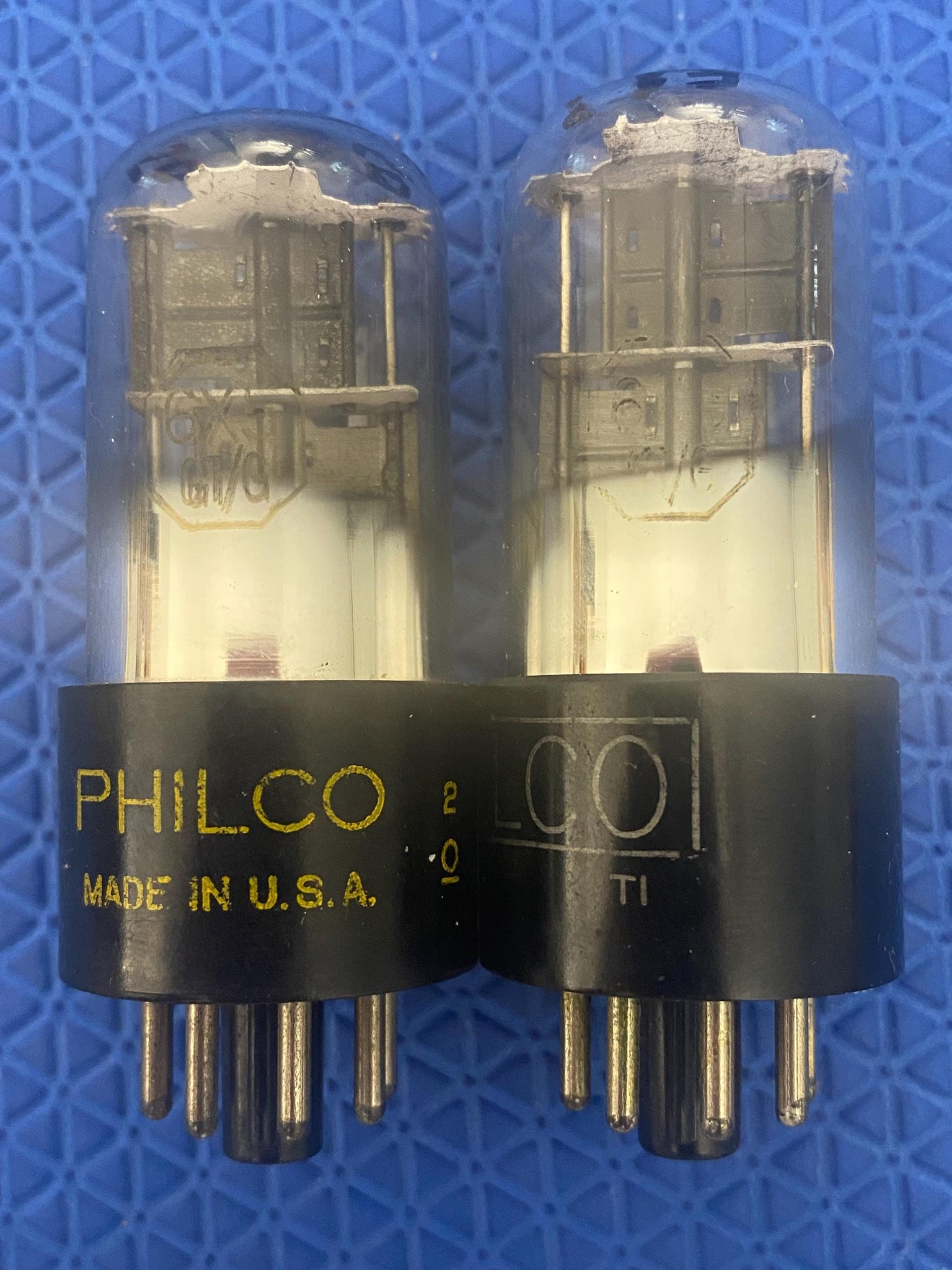 This matched pair of Sylvania-MANUFACTURED 6X5GT rectifier tubes was tested on our Paul Hart-calibrated TV7/U for shorts, gas and emissions. There were no shorts or gas.