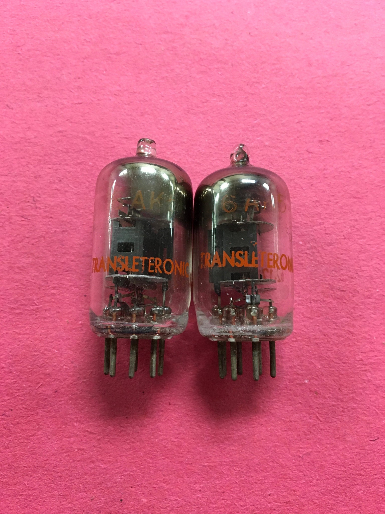 This new old stock, new in box matched pair of Transleteronic 6AK5 tubes was tested on our Paul Hart-calibrated TV7/U for shorts, gas and transconductance. There were no shorts or gas.