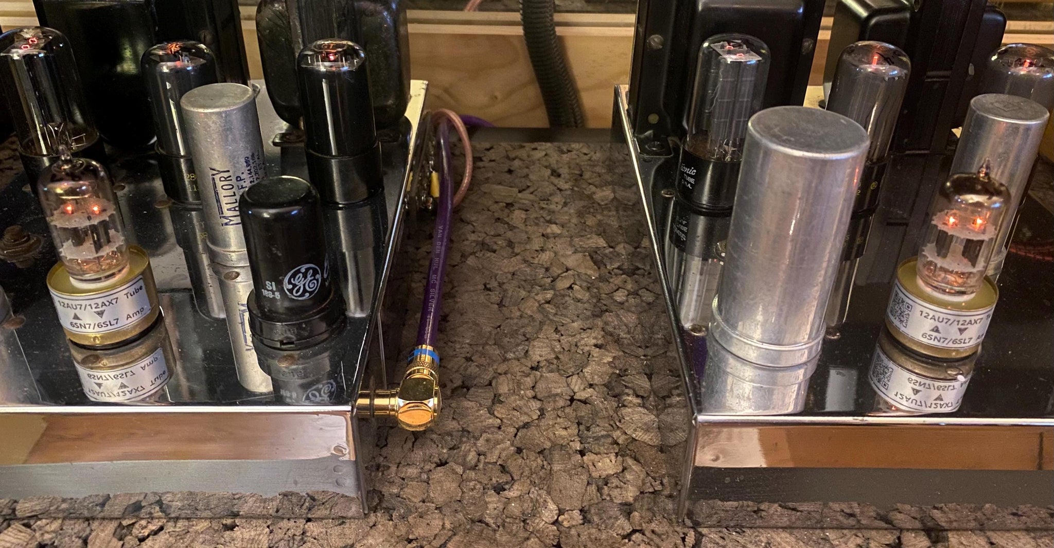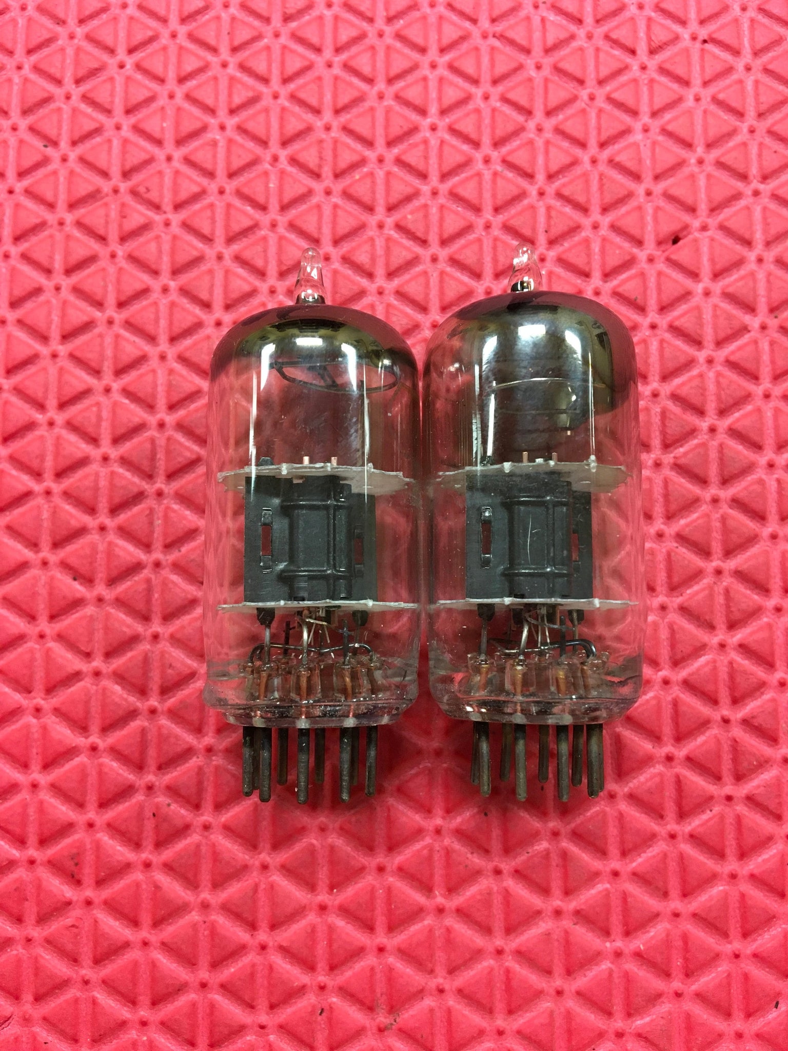 This matched pair of Tung-Sol black plate 12AV7 dual triodes was tested on our Maxi Preamp II for shorts, gas and gain. There were no shorts or gas.