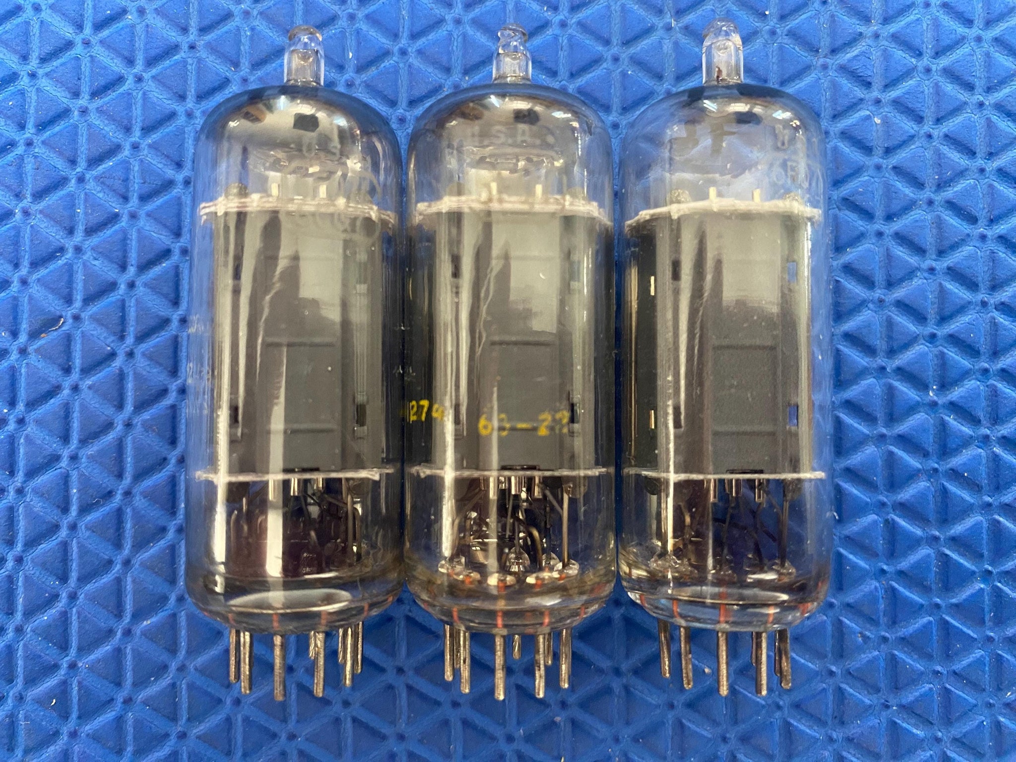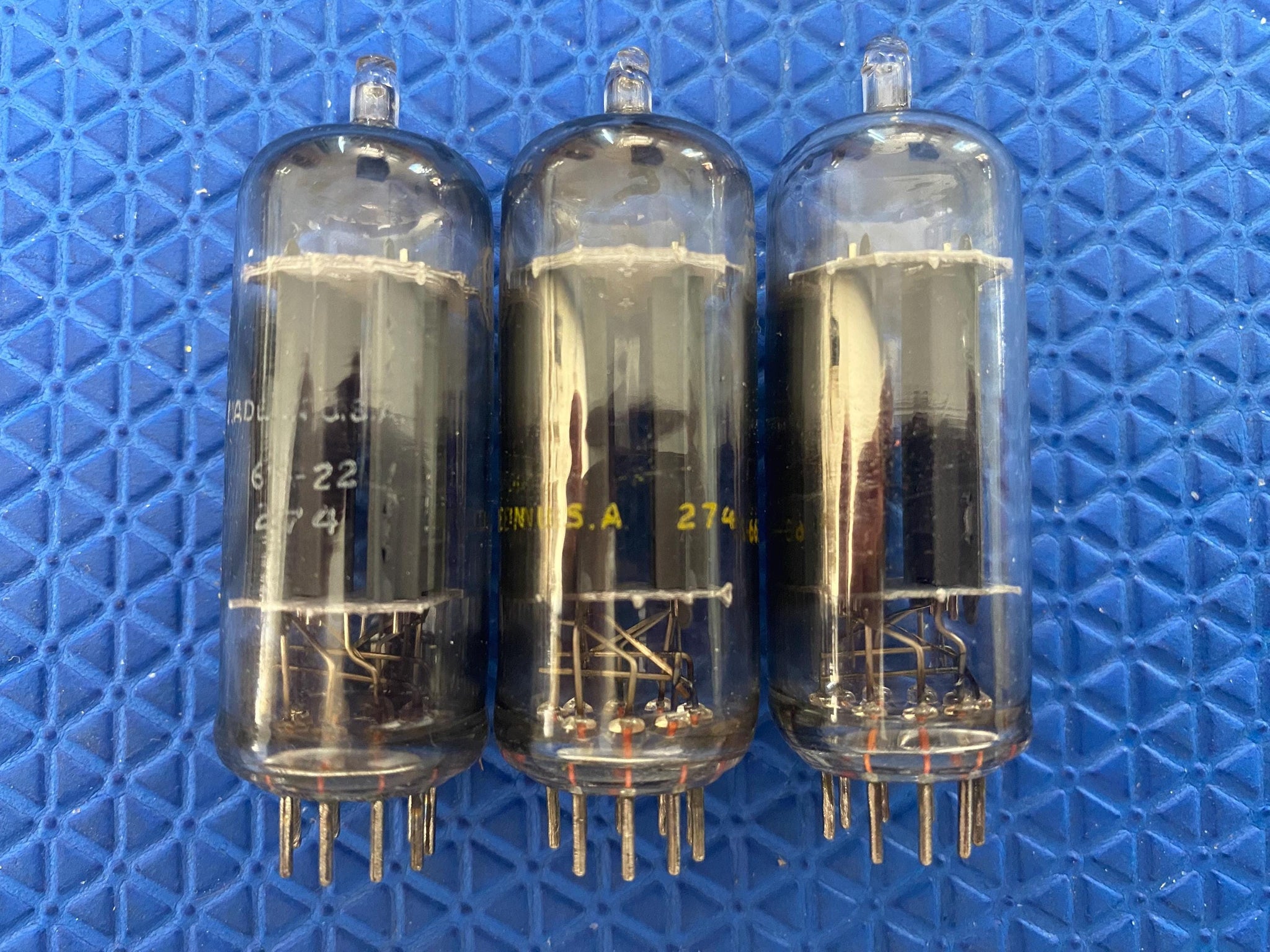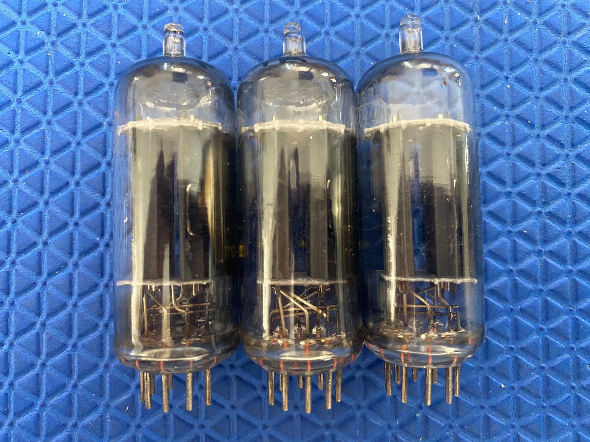 This new old stock-testing matched trio of RCA 6FQ7 / 6CG7 dual triodes was tested on our TV7/U for shorts, gas and transconductance. There were no shorts or gas and their readings are as follows: