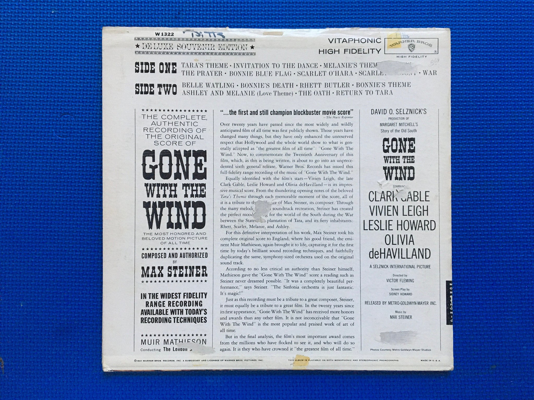 Max Steiner Muir Mathieson Gone With The Wind The Original Score Recording Warner Brothers Records Monophonic LP W1322 1961