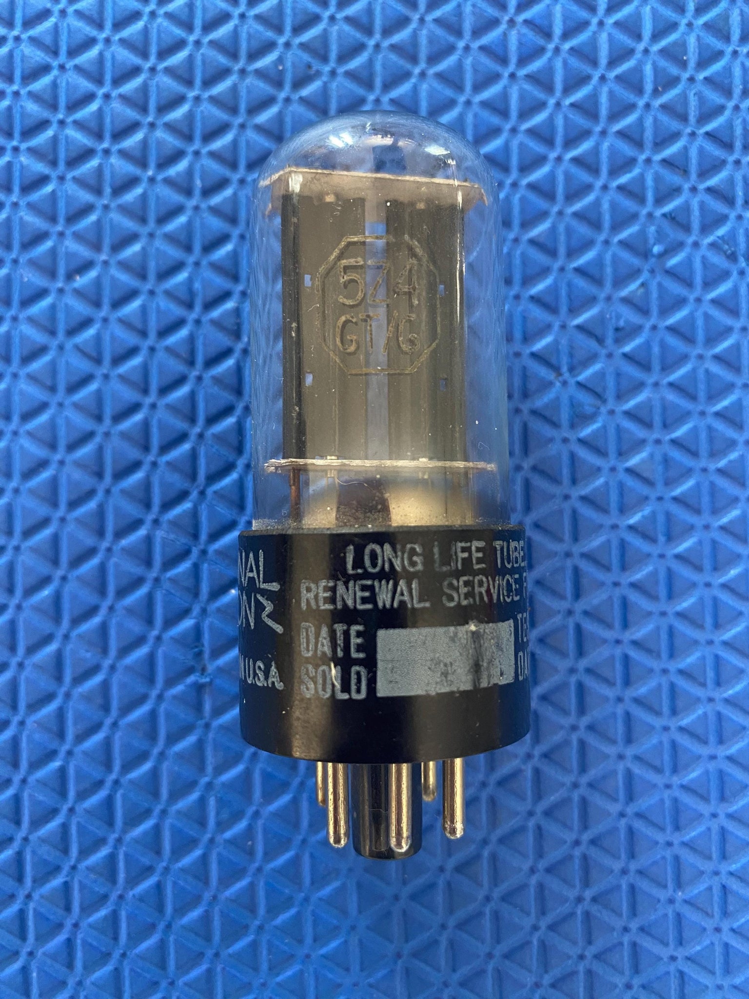 This National Union 5Z4GT/G rectifier tube was tested on our Paul Hart-calibrated TV7 for shorts, gas and transconductance. There were no shorts or Gas.