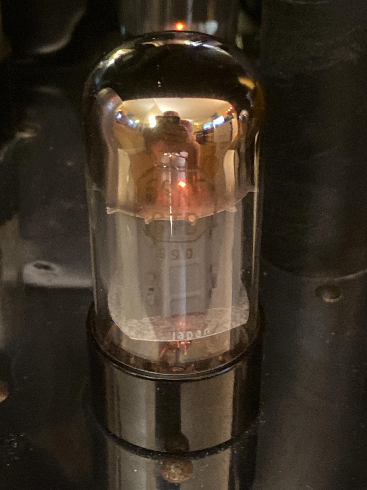 This tube was made in Japan for Channel Master in the early-to-mid late 1970s and has copper support rods; a short base; a tall bottle; gray plates; a top D-getter and terrific flashing.