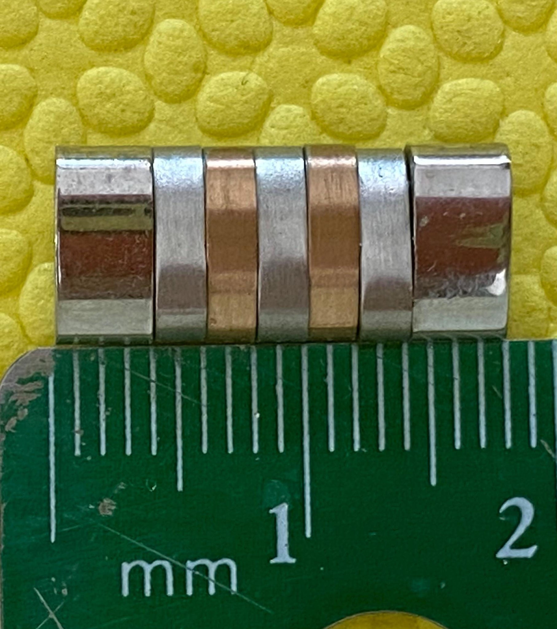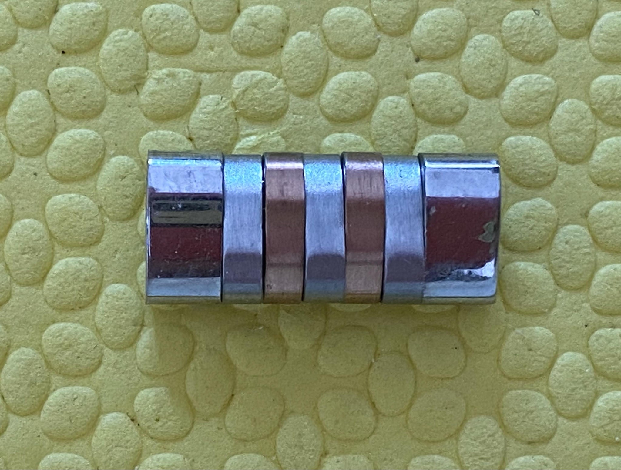 These links appear to be made of stainless steel and rose gold. I cannot guarantee that the copper-colored finish is rose gold; and if it is, it is probably plated. Or maybe not...