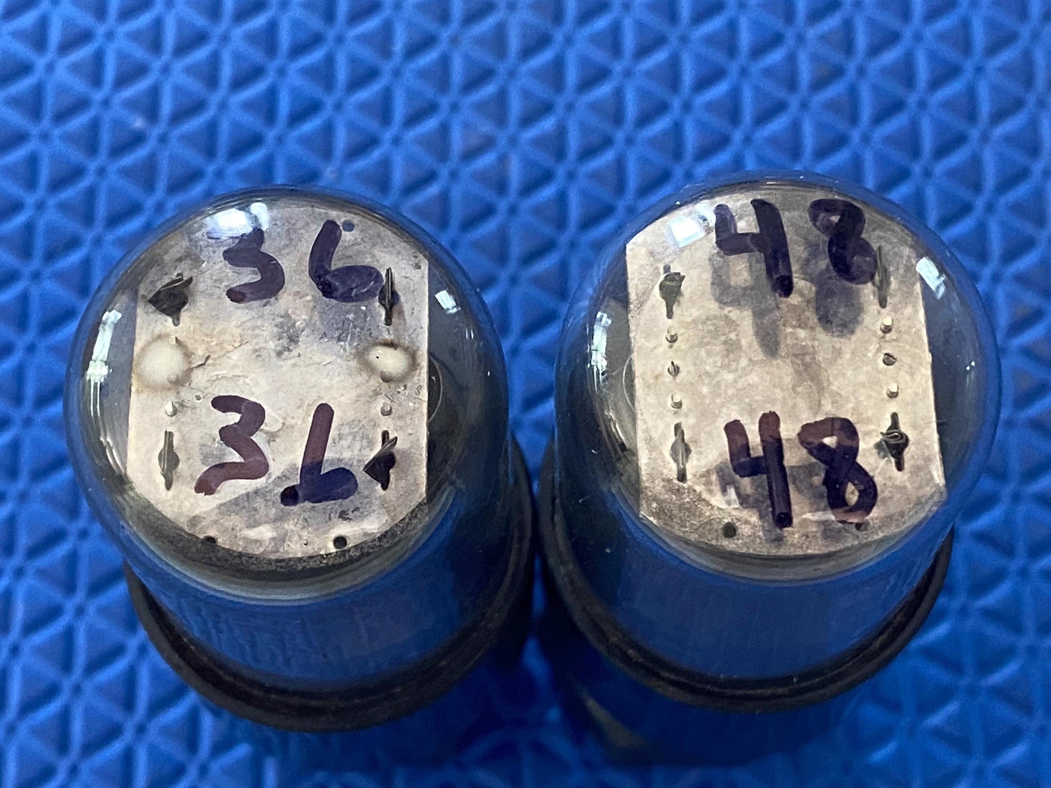 Transconductance measured 36/36 for Tube One and 48/48 for Tube Two where minimum (65%) is 32/32.