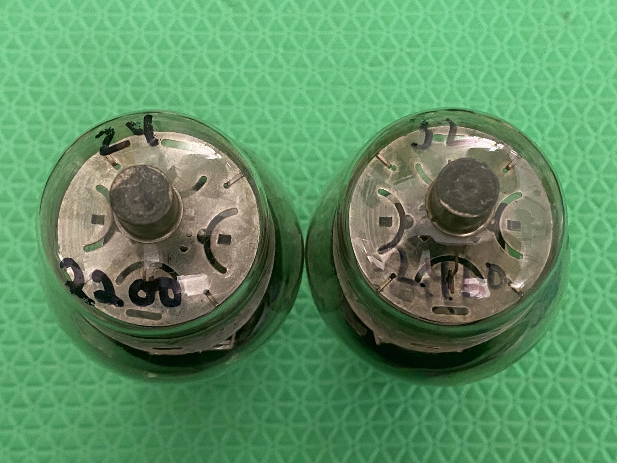 These tubes have nifty shoulder / Coke bottle glass envelopes; wire snubbers; black plates; enormous bottom, double-D getters; steel support rods and anode radiators for cooler operation and longer life.