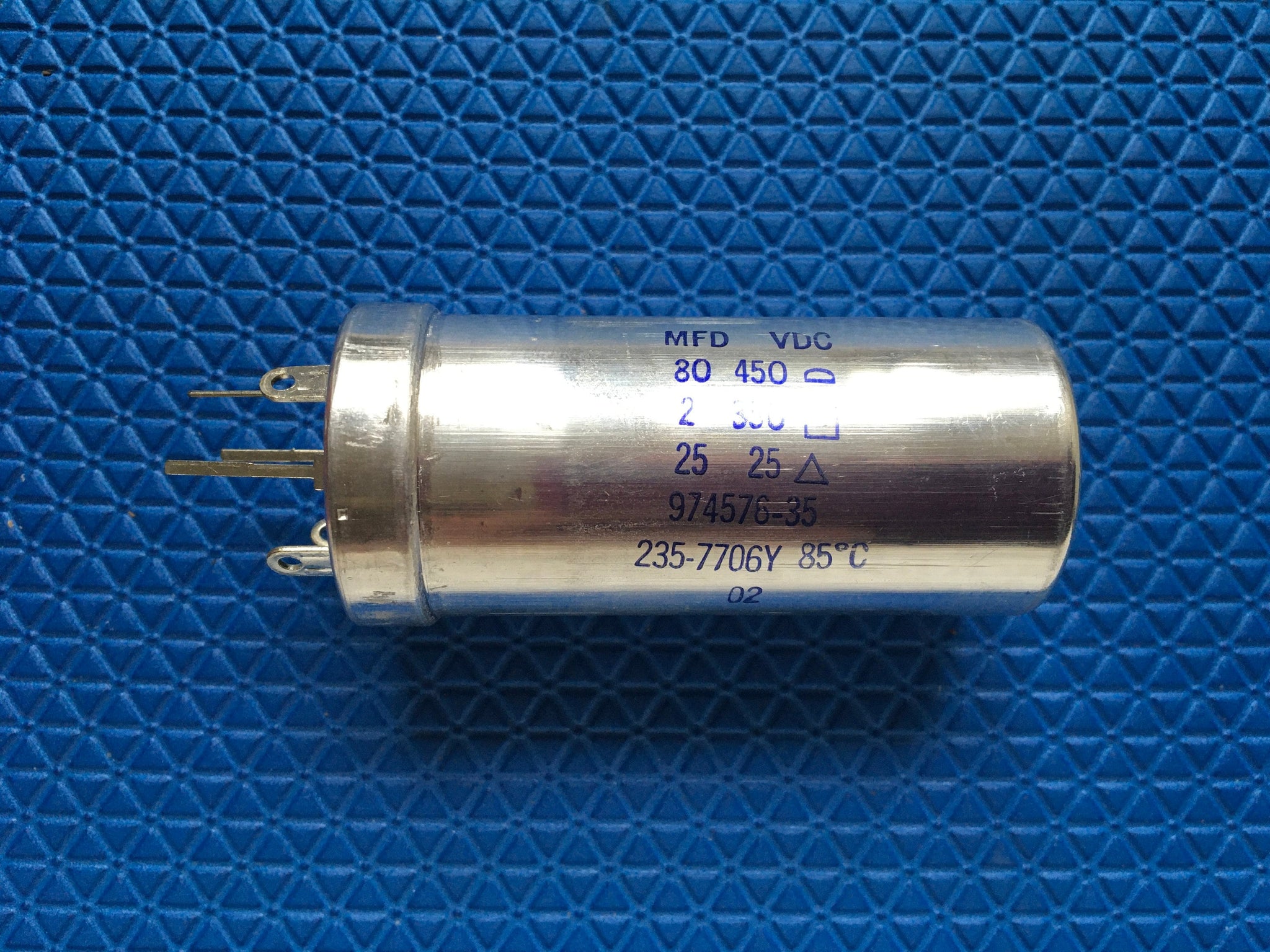 This new old stock three-section electrolytic capacitor tested fine.