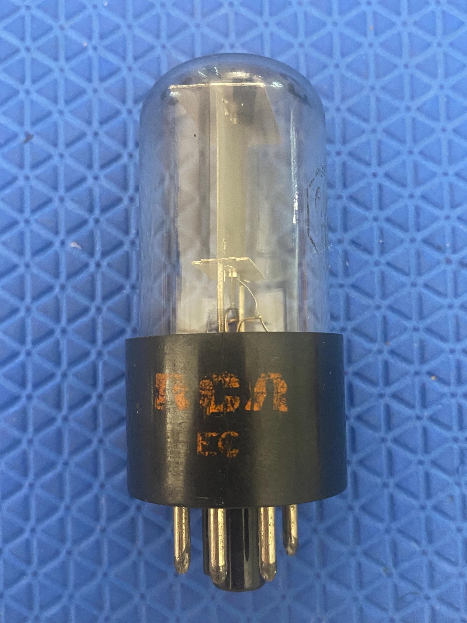 This RCA 6X5GT rectifier tube tested 53/57 on our Paul Hart-calibrated TV7/U where minimum (65%) is 40/40 and 100% is 62/62.