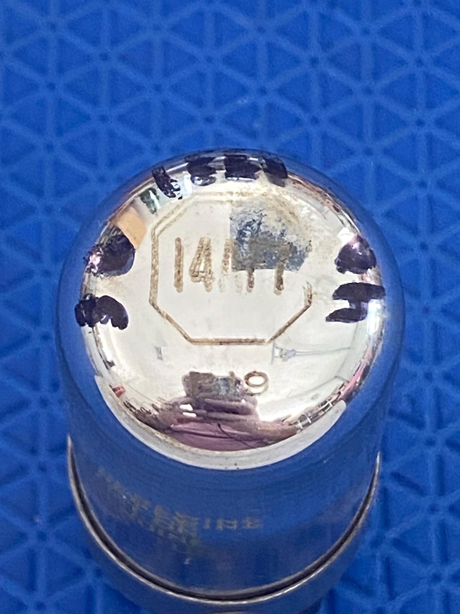 This Sylvania-MANUFACTURED, Philco-LABELED 14AF7 dual triode was tested on our Paul Hart-calibrated TV7/U for shorts, gas and transconductance. There were no shorts or gas and it measured as follows: