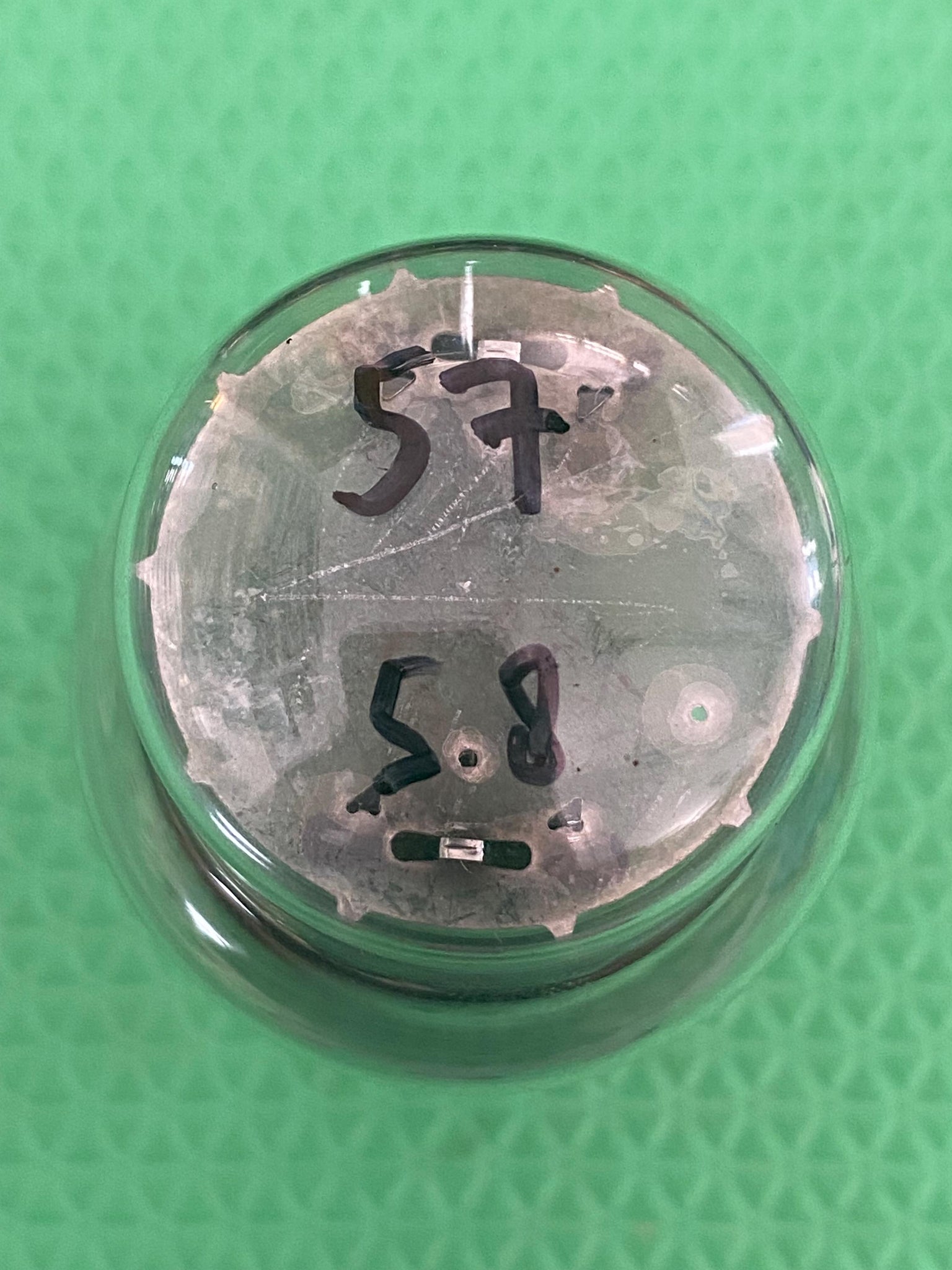 This tube has 352 C date codes, a bottom, D getter and nice flashing. There are a few glass fragments inside the bottle. Fortunately they are inert and don't affect the tubes's operation. Please see picture.