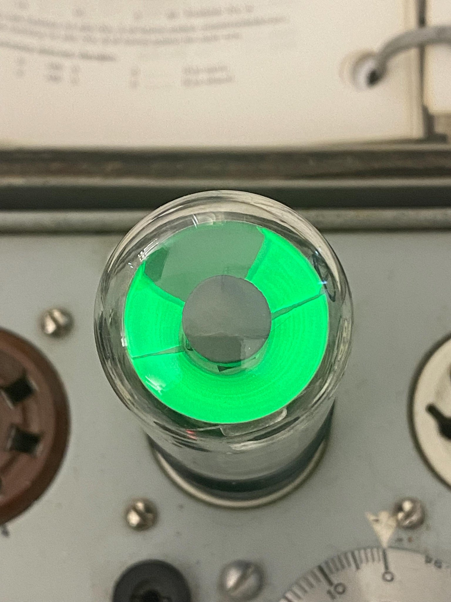 This bright, new old stock-testing Sylvania 6E5 magic eye tube tested to spec on our Paul Hart-calibrated TV7/U.