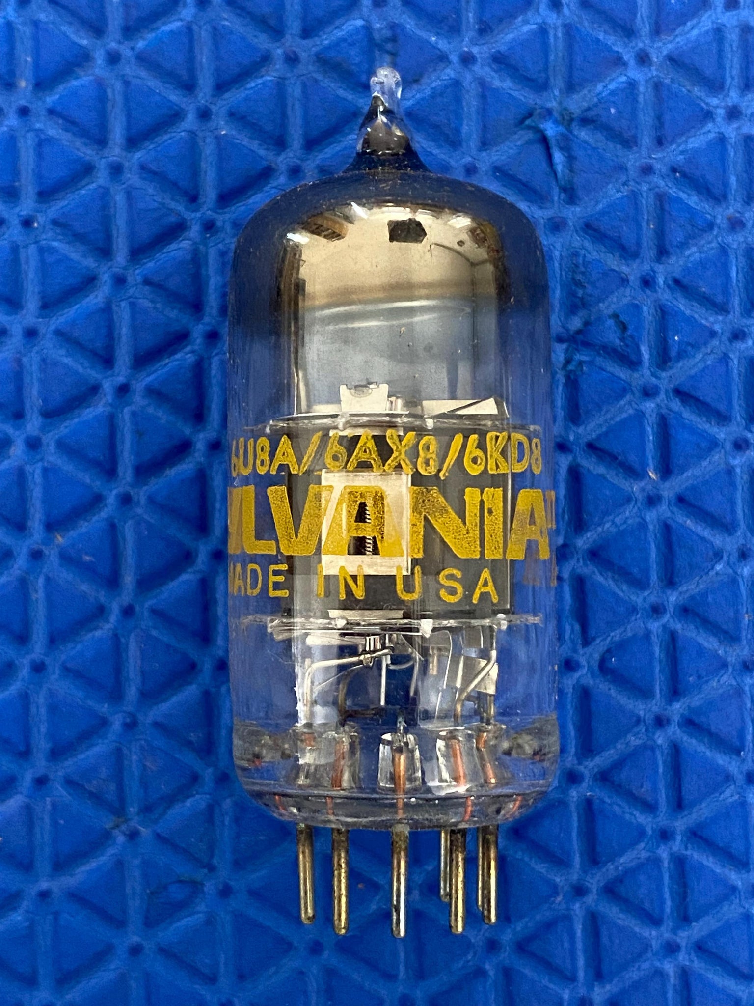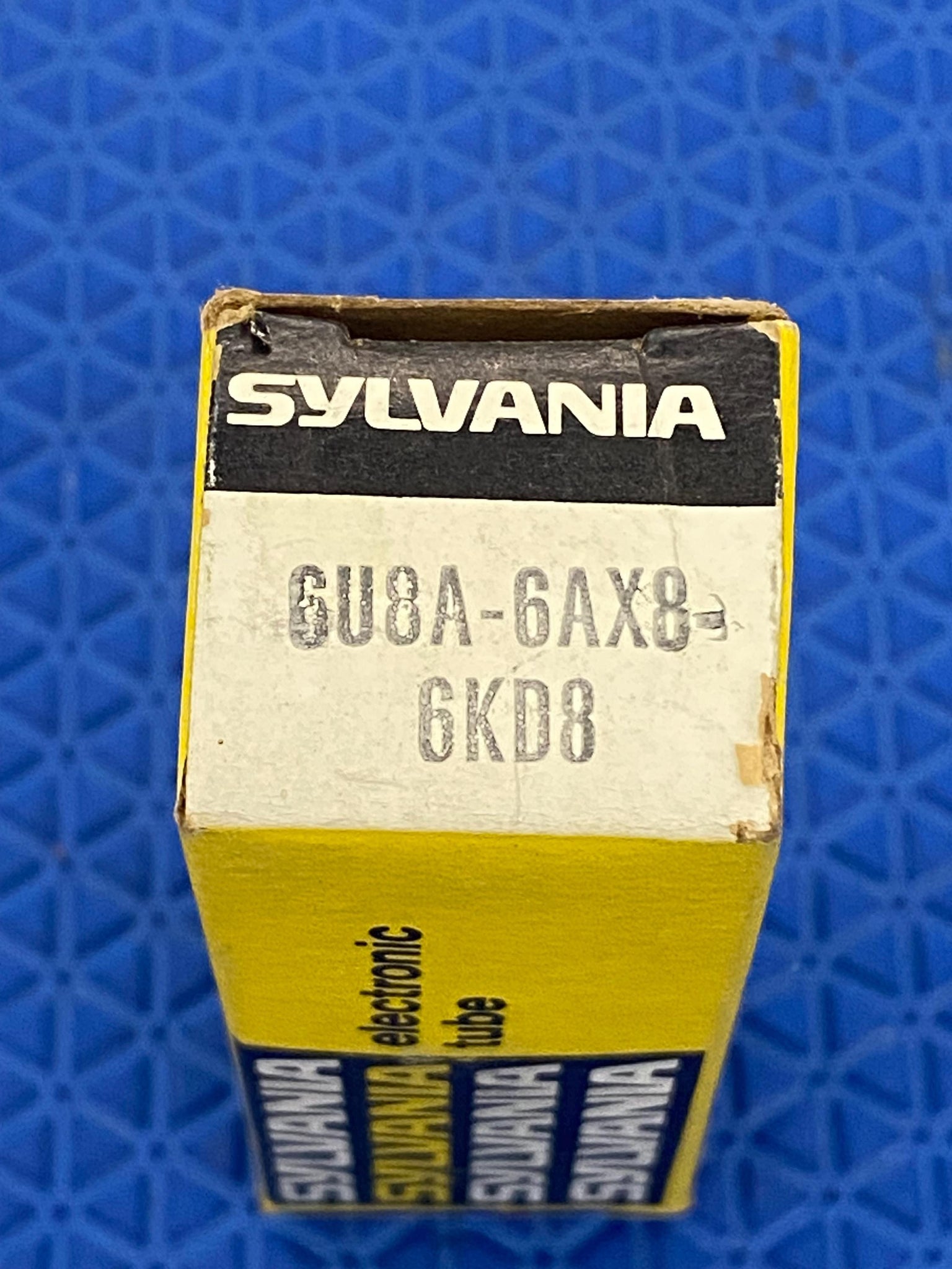 This new old stock, new in box Sylvania 6U8A (ECF82 / 6AX8 / 5KD8 / 6KD8) pentode/triode was tested on our Paul Hart-calibrated TV7/U for shorts, gas and transconductance. There were no shorts or gas.